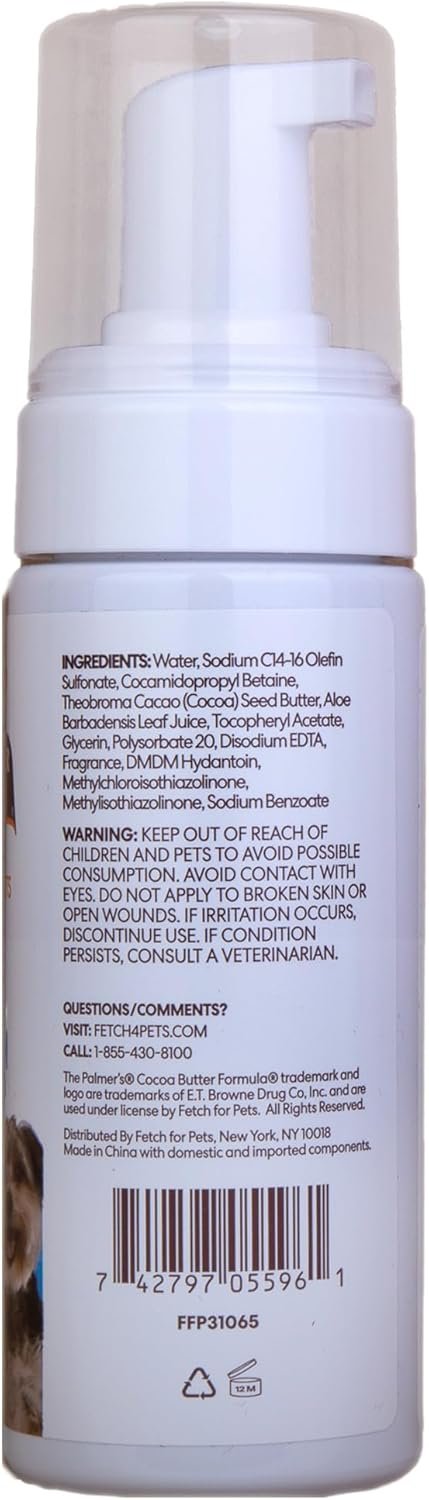 For over 175 years Palmer’s® brand has cared for your skin, now the same high quality products are available for your pets! Palmer’s for Pets No-Rinse Dog Bath Foam is great to use between baths for a quick clean-up. This waterless dog foam also contains cocoa butter for added moisture, leaving your pet feeling clean and silky soft.
