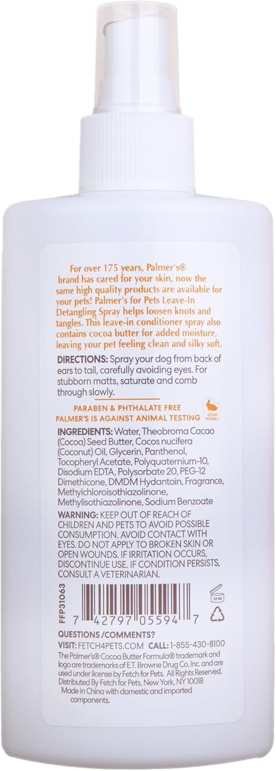 For over 175 years, Palmer’s® brand has cared for your skin, now the same high quality products are available for your pets! Palmer’s for Pets Leave-In Detangling Spray helps loosen knots and tangles. This leave-in conditioner spray also contains cocoa butter for added moisture, leaving your pet feeling clean and silky soft. If your pet has fur that easily tangles or gets matted, using a detangling spray regularly can help to reduce the effort it takes to brush and groom. Leave-in dog conditioners are also excellent for dogs with dry, brittle, and generally unkempt fur. For a softer, silkier, and better-smelling pooch, try Palmer’s for Pets Detangling & Conditioning Spray with Cocoa Butter and Vitamin E.