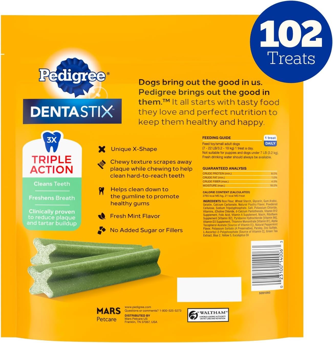 Dogs bring out the good in us. Pedigree brings out the good in them. With Pedigree Dentastix toy and small breed dog treats fresh flavor, these dental treats for dogs let pet owners offer a tasty snack while keeping oral hygiene in mind as part of an everyday oral care daily routine. These dental care treats are formulated with no added sugar or fillers and can be served once a day to toy and small breed dogs that are 7 to 22 lbs. Pedigree Dentastix is designed with a distinctive X-shape and a chewy texture that supports plaque removal by scraping away buildup while your canine chews, cleaning hard-to-reach areas around teeth. These small dog dental chews provide triple action that cleans teeth, supports breath freshness for fresh breath for dog, and helps reduce tartar buildup for tartar control and dental health maintenance. This fresh-flavored dental chew is a pet dental product that helps dog parents support the smile they love, while still being a convenient daily treat.
