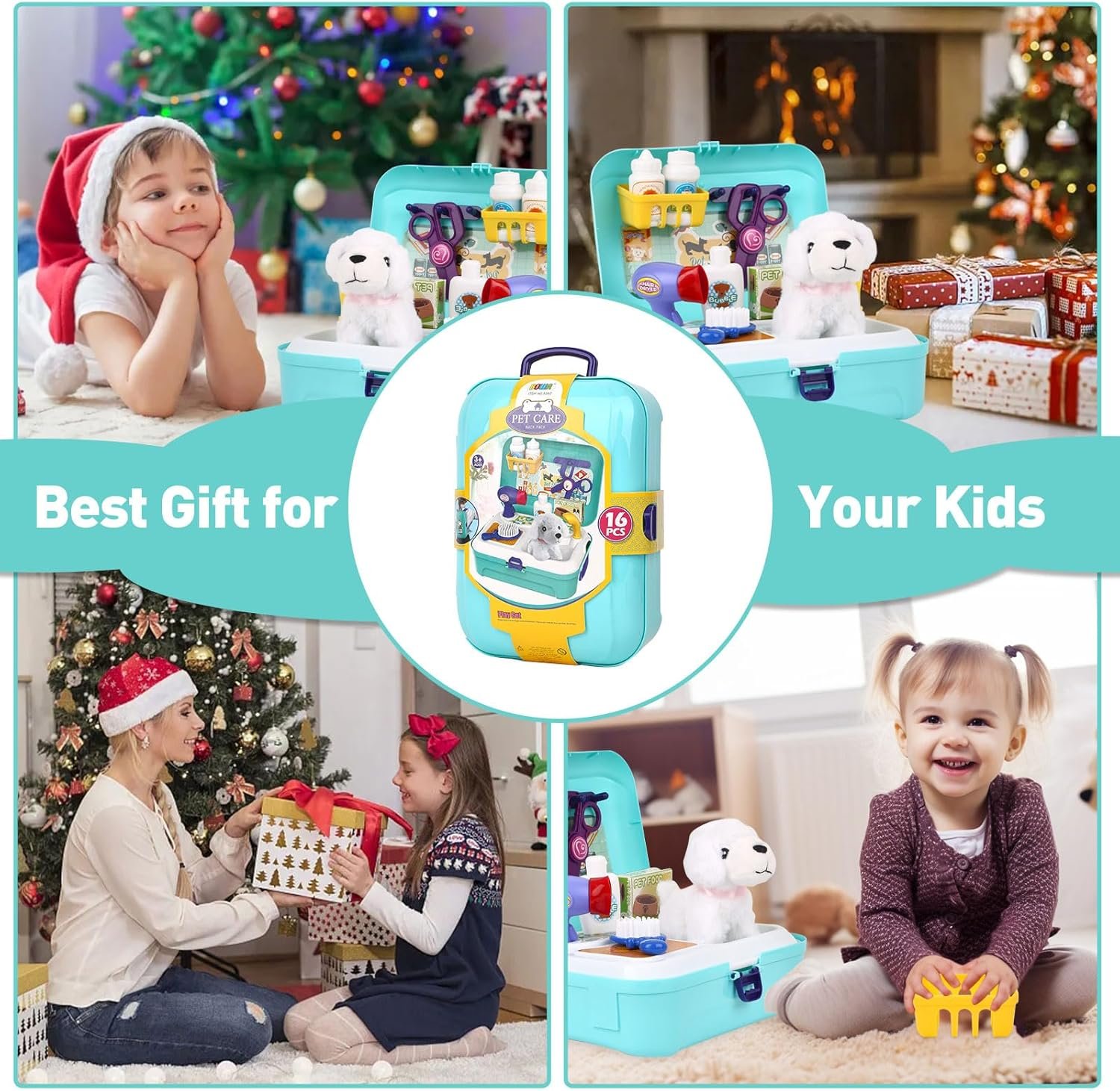 Pet Care Play Set for Kids, 16Pcs Doctor Kit Pretend Play Vet Puppy Dog Grooming & Feeding Toys with Backpack, Educational Toys for Girls and Boys 3-7 Years Old