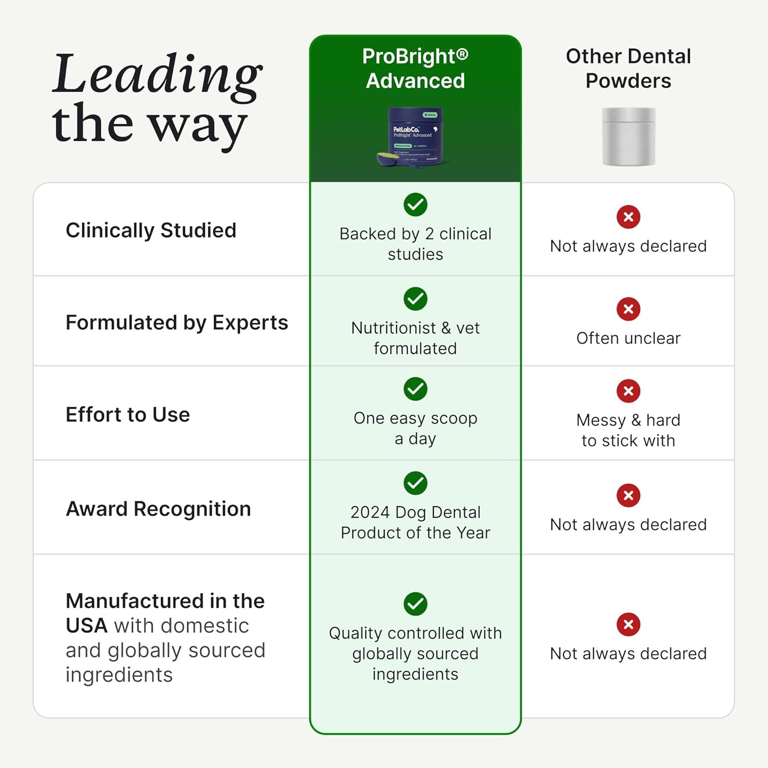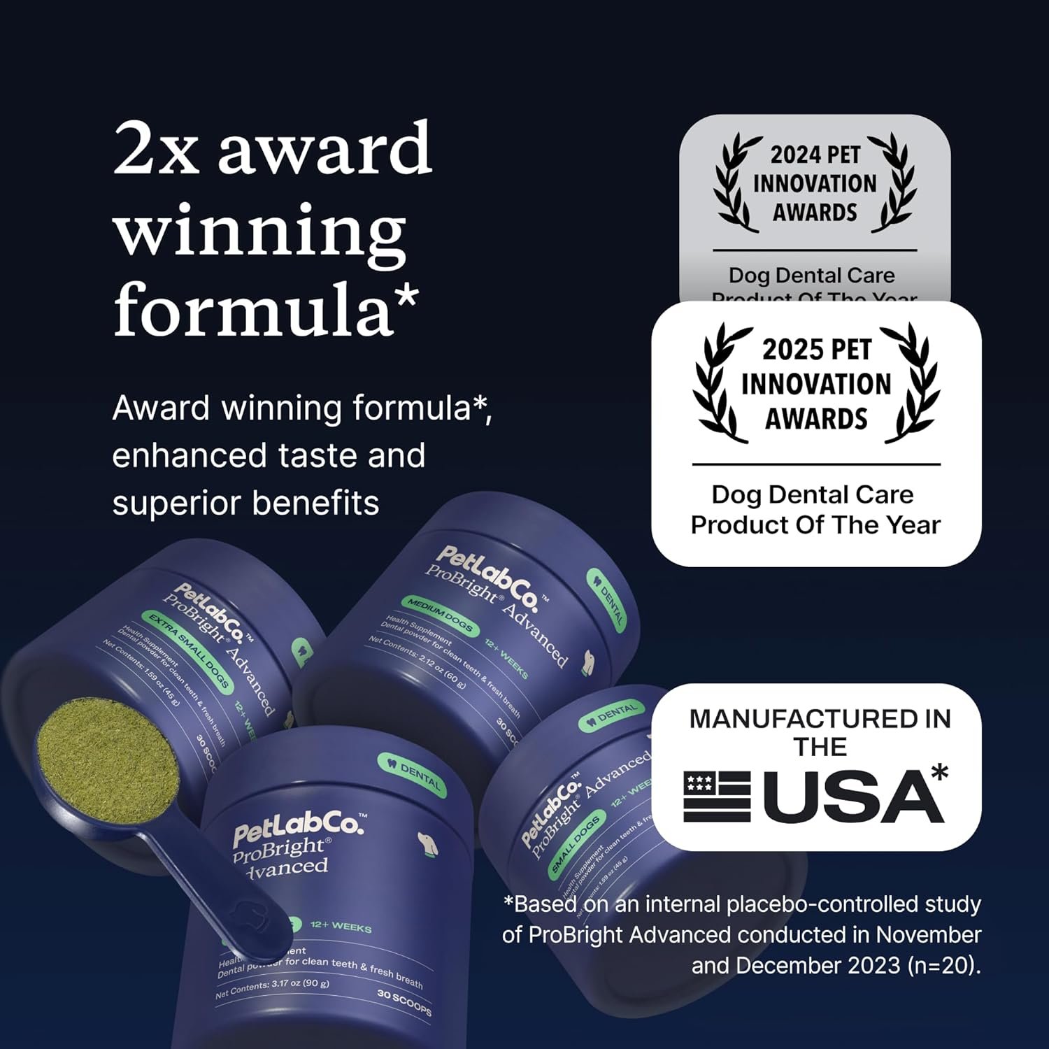 Award-Winning, Clinically Tested* Formula: ProBright Advanced is the dog dental care product of the year, now with a new flavor, superior ingredients, and a clinically tested formula. In just 28 days, daily use was shown to significantly reduce bad breath-causing compounds. Say goodbye to toothpaste, brushing battles, and dental sticks. Say hello to ProBright, advanced, effortless oral care at its best