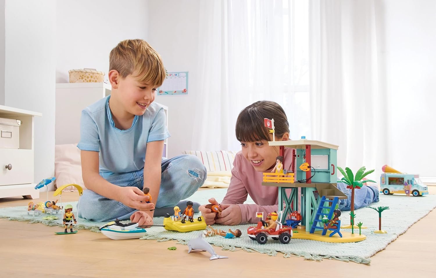 Rescue Mission on the Beach! Sun, sand, and exciting missions – there’s always something happening at the PLAYMOBIL Lifeguard Tower! Sun, sand, and seaside rescues – it’s all in a day’s work at the PLAYMOBIL Lifeguard Tower! With two floors, a sliding pole, and a fully equipped lifeguard station, lifeguards can watch over beachgoers and leap into action in no time. A jellyfish alarm or a pinching crab? No problem! The beach buggy fits one figure and can carry the rescue board for quick getaways, while the lower level houses a repair workshop with tools and spare tires. A brave rescue dog with a life jacket joins the mission, along with a cool kitesurfing setup. This detailed PLAYMOBIL set is packed with action, accessories, and endless summer adventure fun! Recommended for ages four to ten years. Warning. Choking Hazard. Small Parts. Not for children under 3 years.