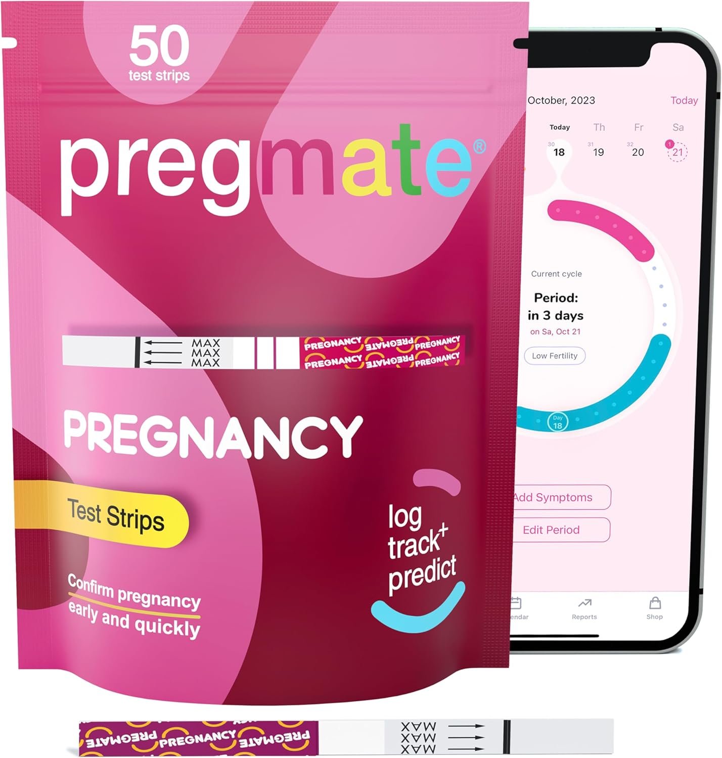 Pregmate Pregnancy Test Strips on a pink surface next to smartphone displaying fertility appPregmate Pregnancy Test Strips on a pink surface next to smartphone displaying fertility app