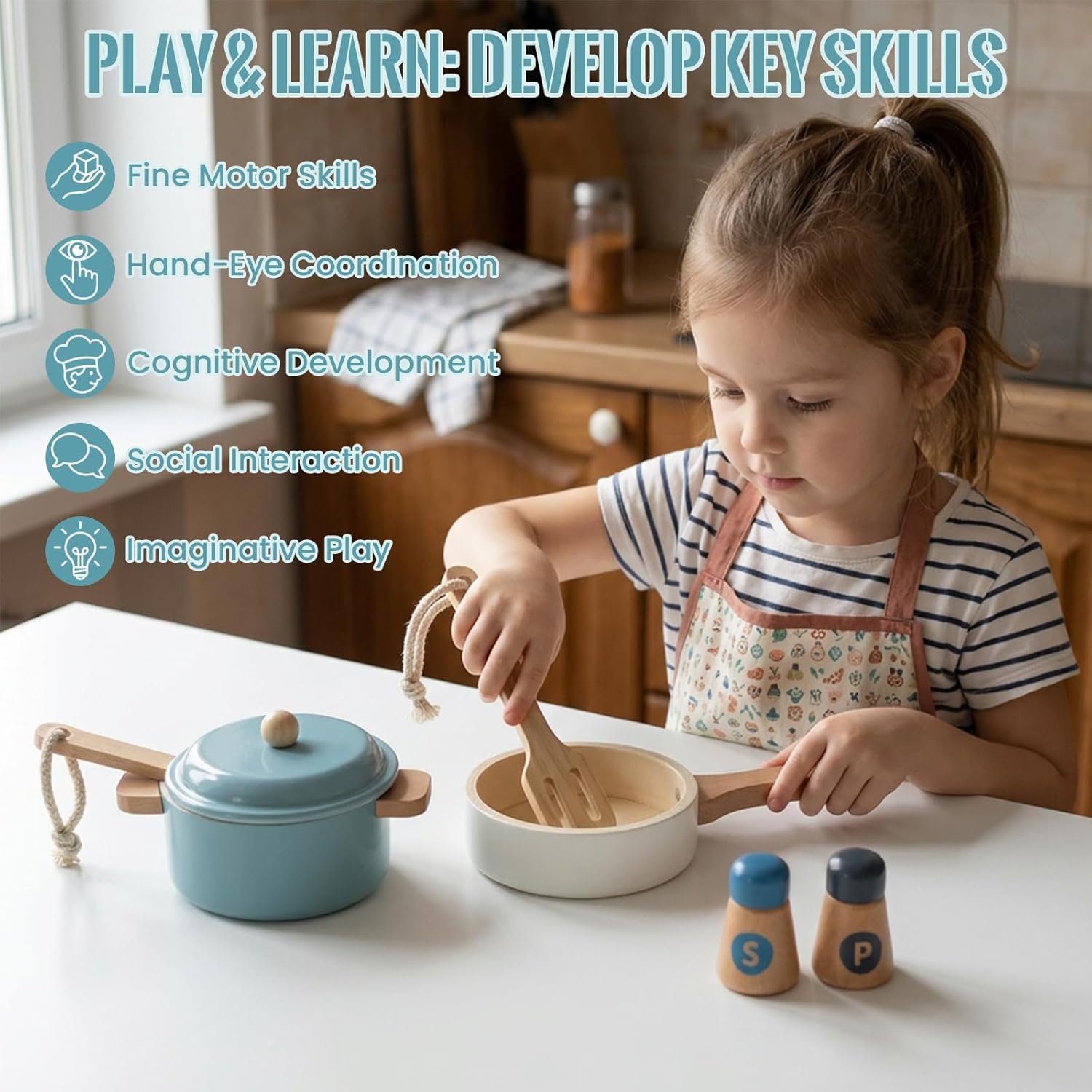 The Wooden Toy Pots and Pans Cookware Playset supports the development of fine motor skills, hand-eye coordination, and creative thinking.
