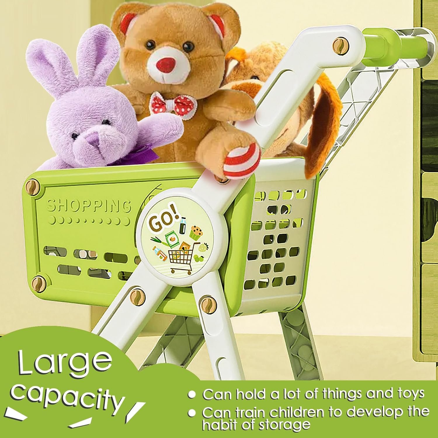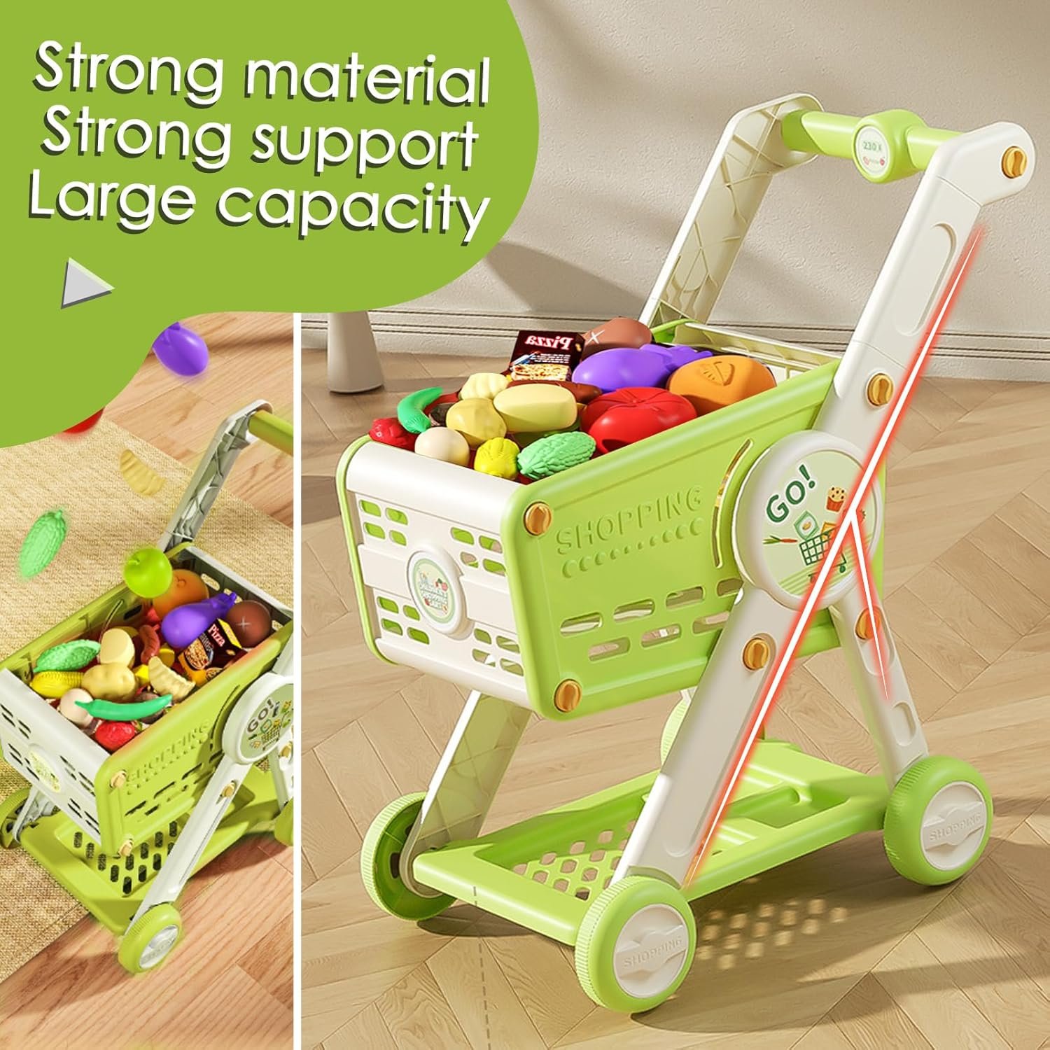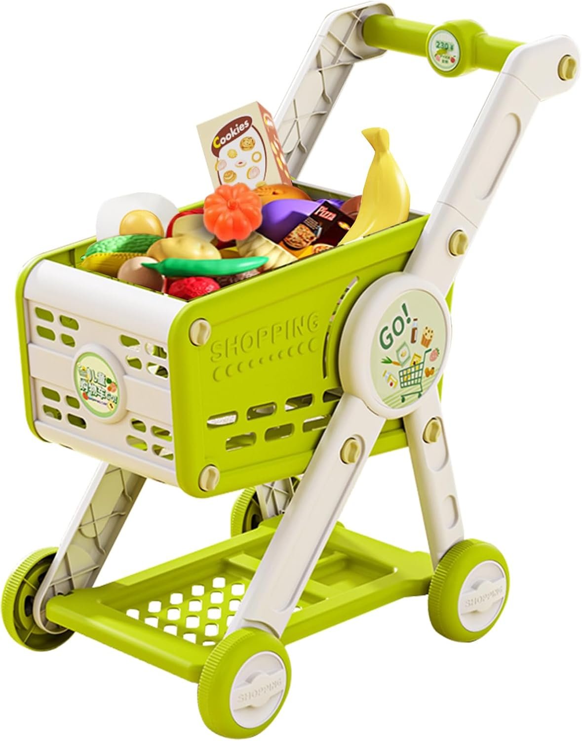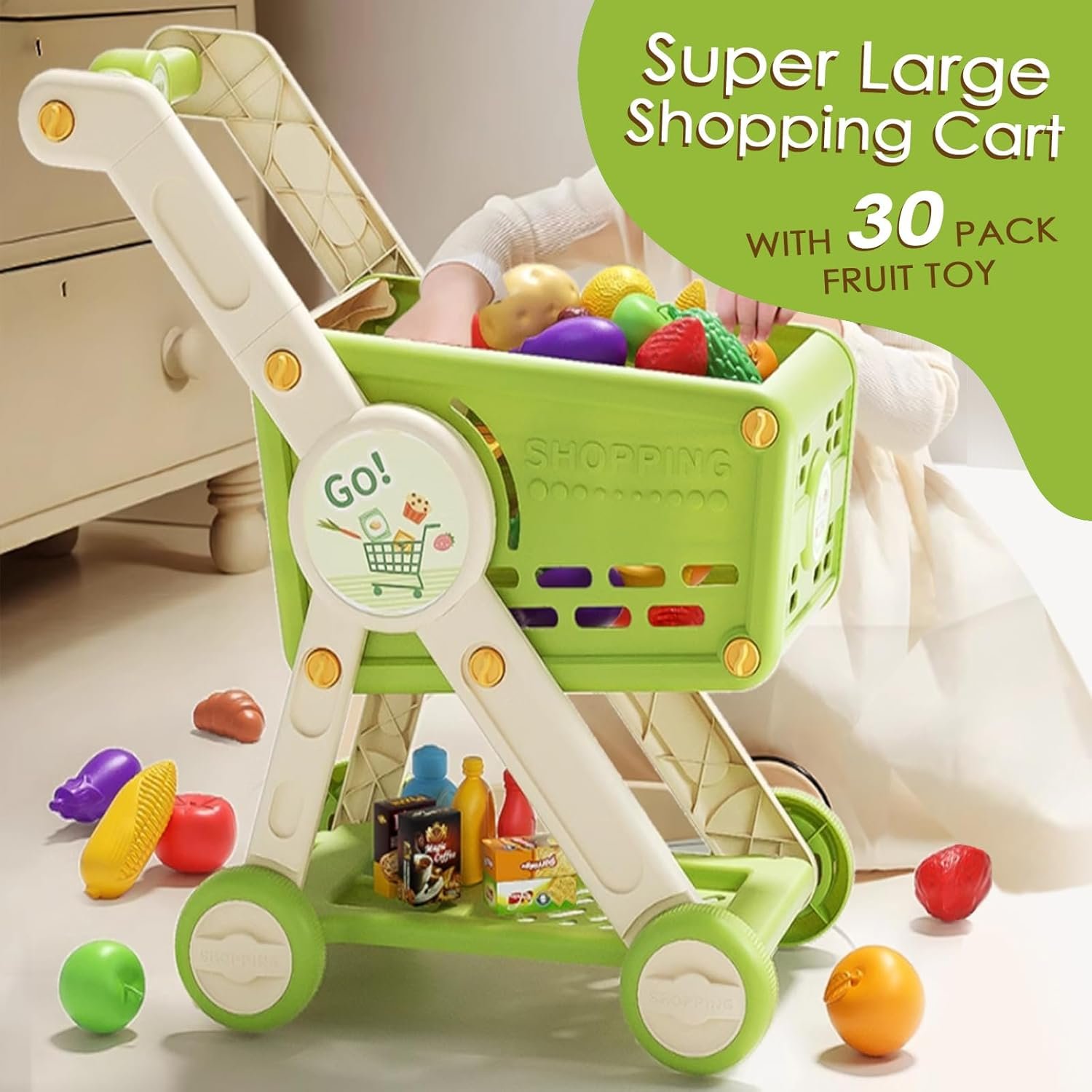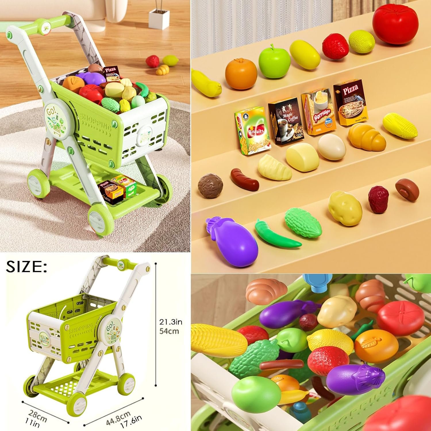 Big Size Realistic Shopping Cart: This shopping cart designed to resemble a real grocery cart,it comes with 1 toy shopping cart and 30 play food.Push home a cart full of of tasty-looking toy groceries for a make-believe feast. Plus, thr cart doubles as a storage container