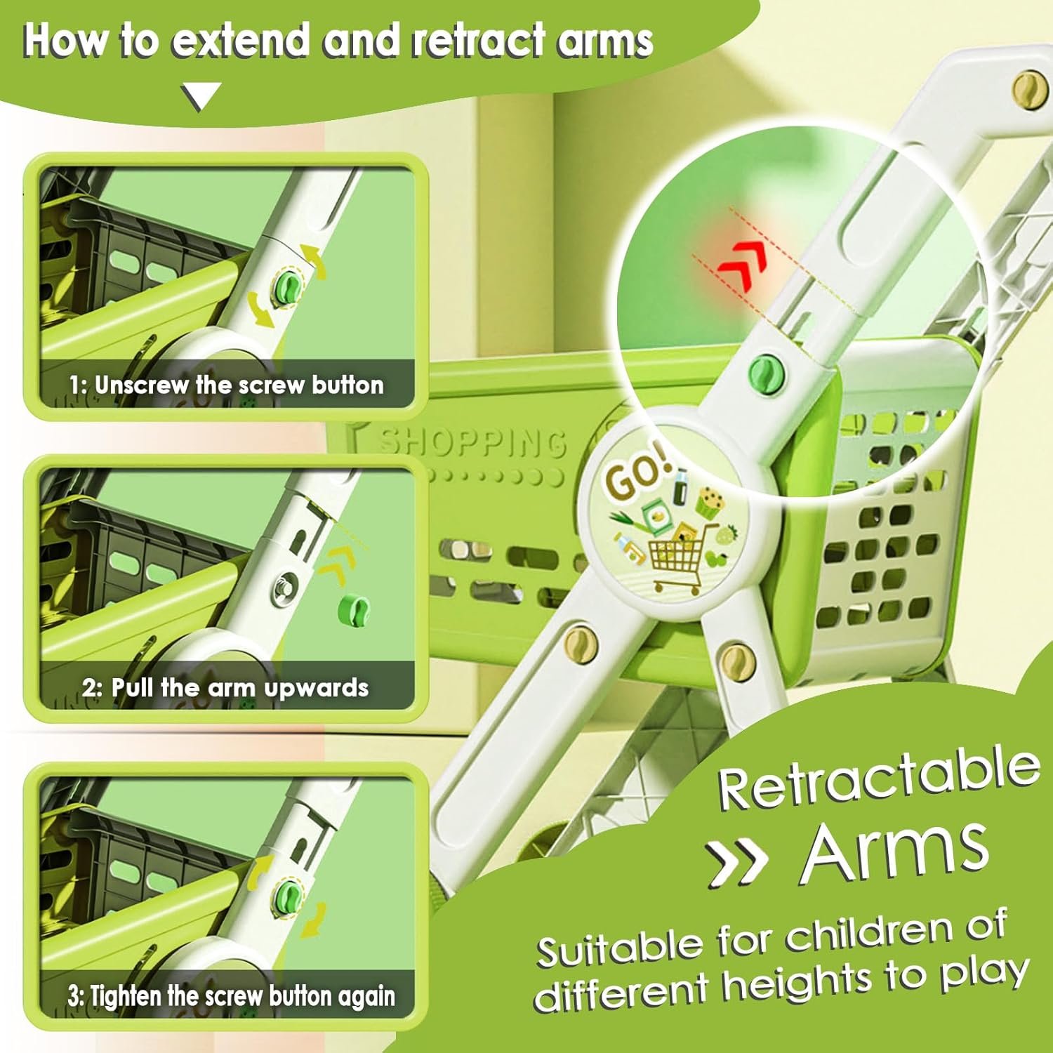 Large Capcity & adjustable Design: The basket above our shopping cart has a compartment design, and the partition below can also hold items, ensuring enough capacity to carry all accessories. It can also be used as storage and to hold children’s stuffed toys, etc.The arms are adjustable to fit children of all heights