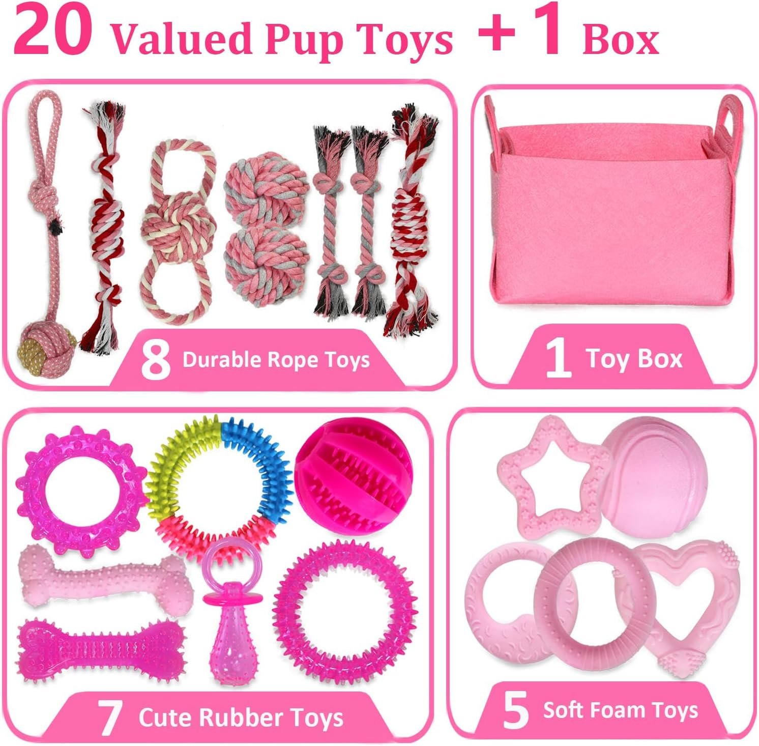 Exciting Toy Variety: This set includes 20 cute and fun toys, perfect for puppies and small dogs. With a variety of options, including rope toys, a treat dispenser ball, rubber toothbrush bone toy, tug of war toy, a pacifier toy, and teething rings, your furry friend will never get bored.