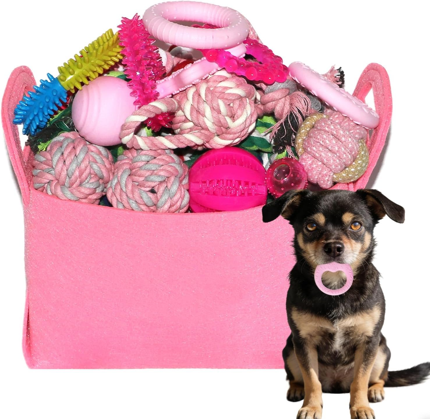 High-quality dog toy storage basket (9.8’’L x 7’’W x 5.9’’H): This detachable, high-quality felt storage bag is perfect for organizing dog supplies and toys, keeping your home tidy.