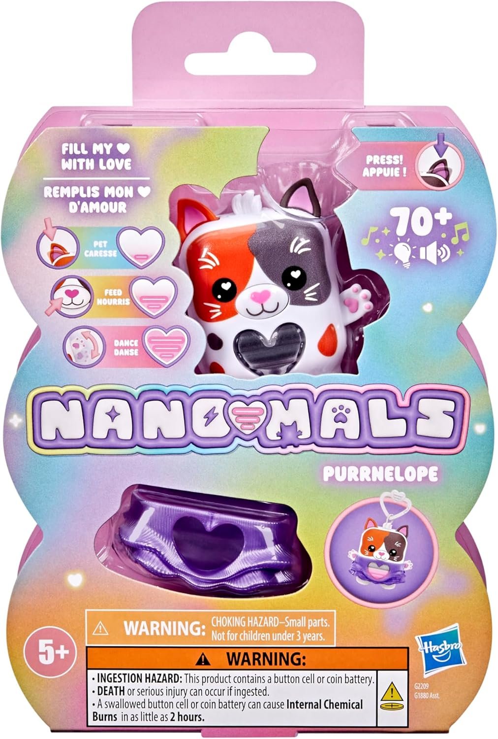Unlock a world of fidgety, fashionable pocket-sized pets with Nano-mals Purrnelope the calico kitty. Nano-mals are electronic fidget toys and adorable mini companions that need your love! Each Nano-mals character has a color-changing heart meter that kids can fill in so many fun and satisfying ways. When Purrnelope’s heart meter drops, she’ll make sounds to let you know she needs care. If her heart meter is blue, she needs pets, so press her ears. If her heart is orange, she’s hungry — press her mouth to pretend feed her. Is her heart pink? Click her arms up and down to make her dance. What about purple? She wants to move! Flip, catch, or shake to fill her heart. Purrnelope will celebrate her full heart with a song and colorful lights show. Give Purrnelope some extra flair with a textured snap-on purple dress. Plus, she comes with an attached clip, so she makes a great kids keychain. Nano-mals are the perfect gift for kids who love animal toys, digital pets, and fidget toys. Nano-mals and Hasbro and all related trademarks and logos are trademarks of Hasbro, Inc.