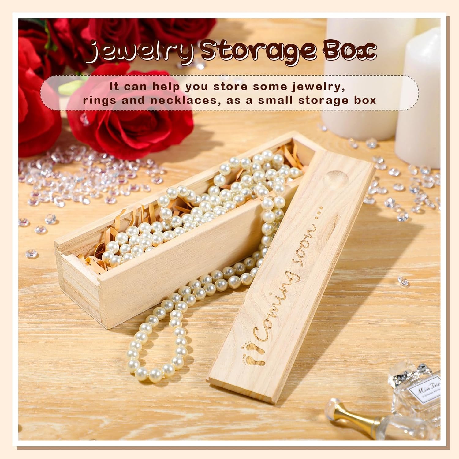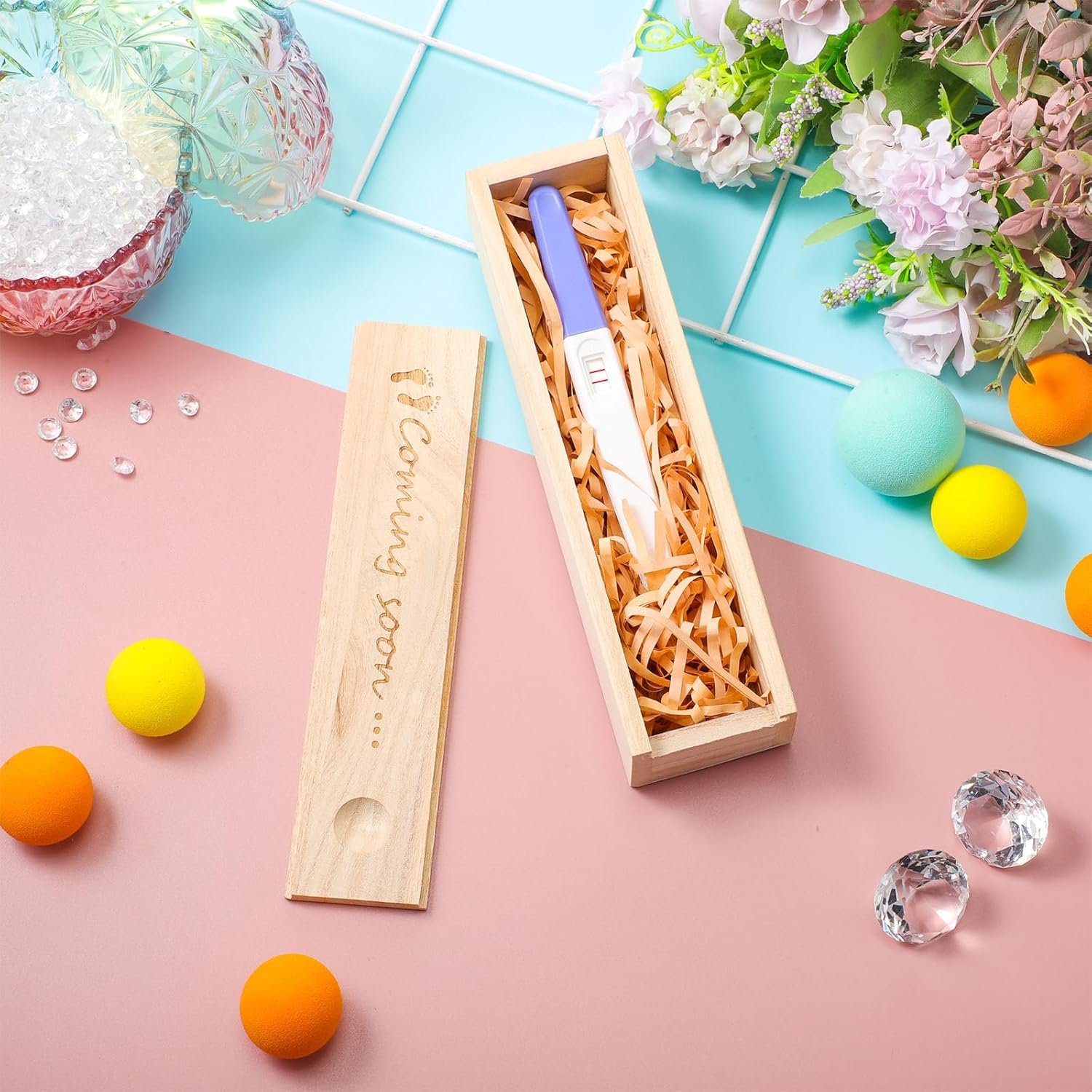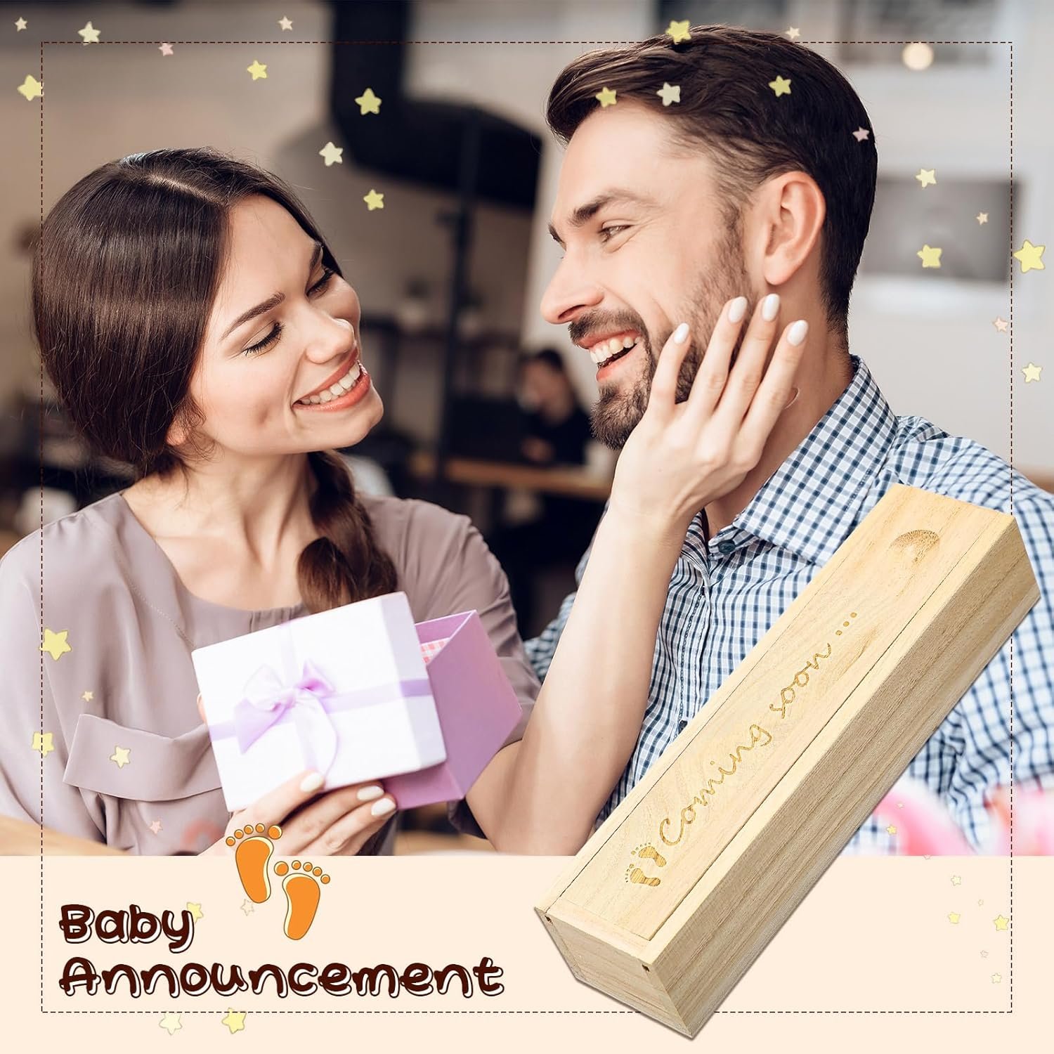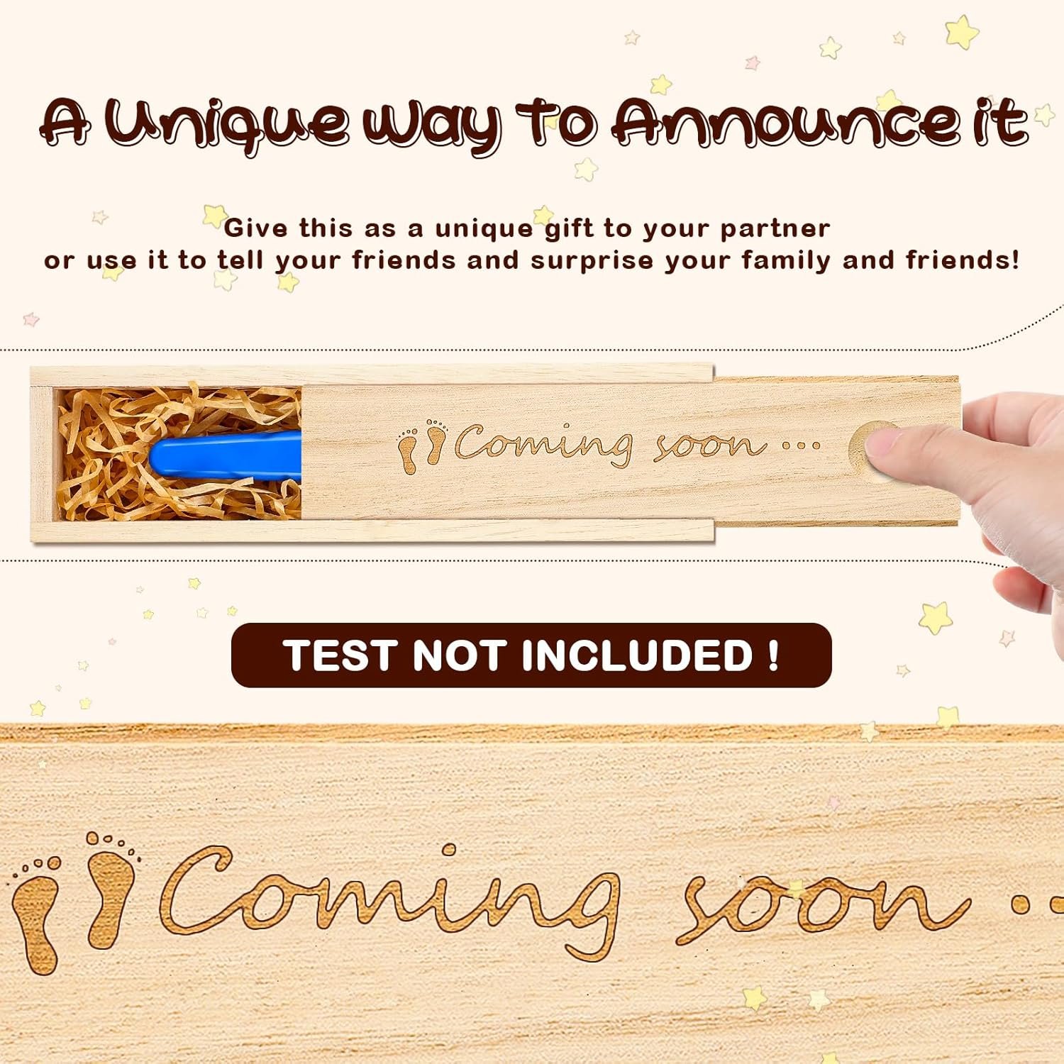 Charming and Meaningful Design: this pregnancy box is carved with [Coming Soon. . . ], and adorned with 2 little footprints on [Coming]’s front, which means a member is coming, meaning and exquisite