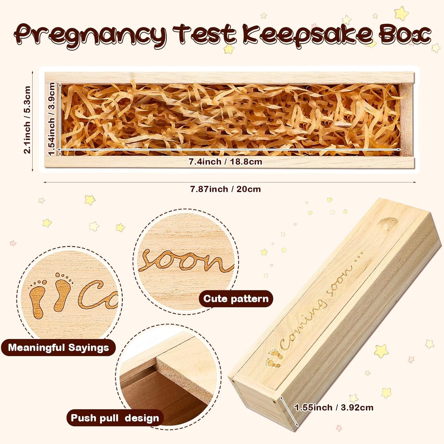 Features: Serviceable and lasting: The pregnancy accessories are made of quality wood, reliable and sturdy, not easy to deform or break, and can be kept for a long time. The surface of the box is smooth and comfortable to touch, easy for you to use. Adorable combination: You will receive 1 piece of souvenir gift box with raffia on it, charming and functional for you to use, and can easily meet your daily use and other requirements. Specifications: Main material: wood Color: natural Size: Outer: approx. 20 x 5.3 x 3.92 cm/ 7.87 x 2.09 x 1.54 inches Inner: approx. 18.8 x 3.9 x 3 cm/ 7.4 x 1.54 x 1.18 inches Package includes: 1 x Pregnancy test keepsake box Notes: Manual measurement, please allow slight errors on size. The color may exist a slight difference due to different screen displays.