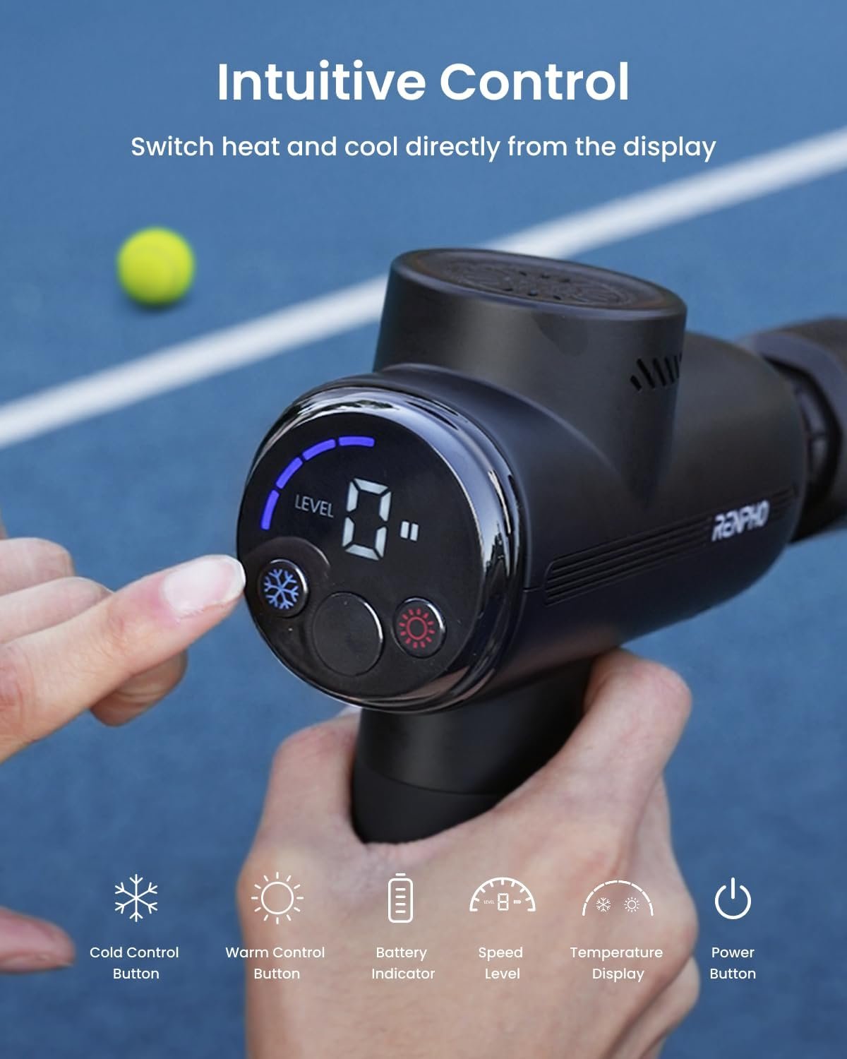 Command Your Recovery: With its integrated VA display, the RENPHO Percussion Massage Gun allows you to clearly monitor speed, battery, and temperature settings, and effortlessly switch between heat and cold therapy without interrupting your massage