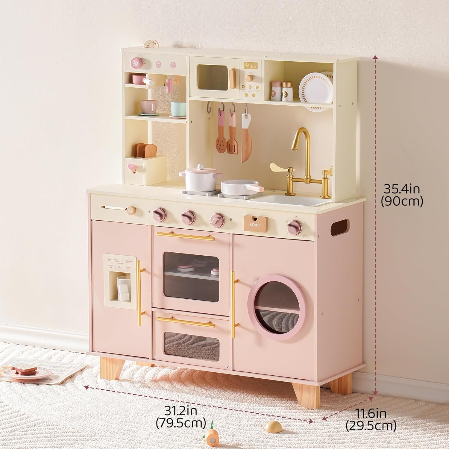 Realistic Features for Pretend Play – Designed as a stylish toy kitchen, every appliance has lifelike knobs, doors, and details. Kids can role-play cooking, cleaning, and baking, making this kitchen for kids an engaging learning experience while boosting hand-eye coordination.