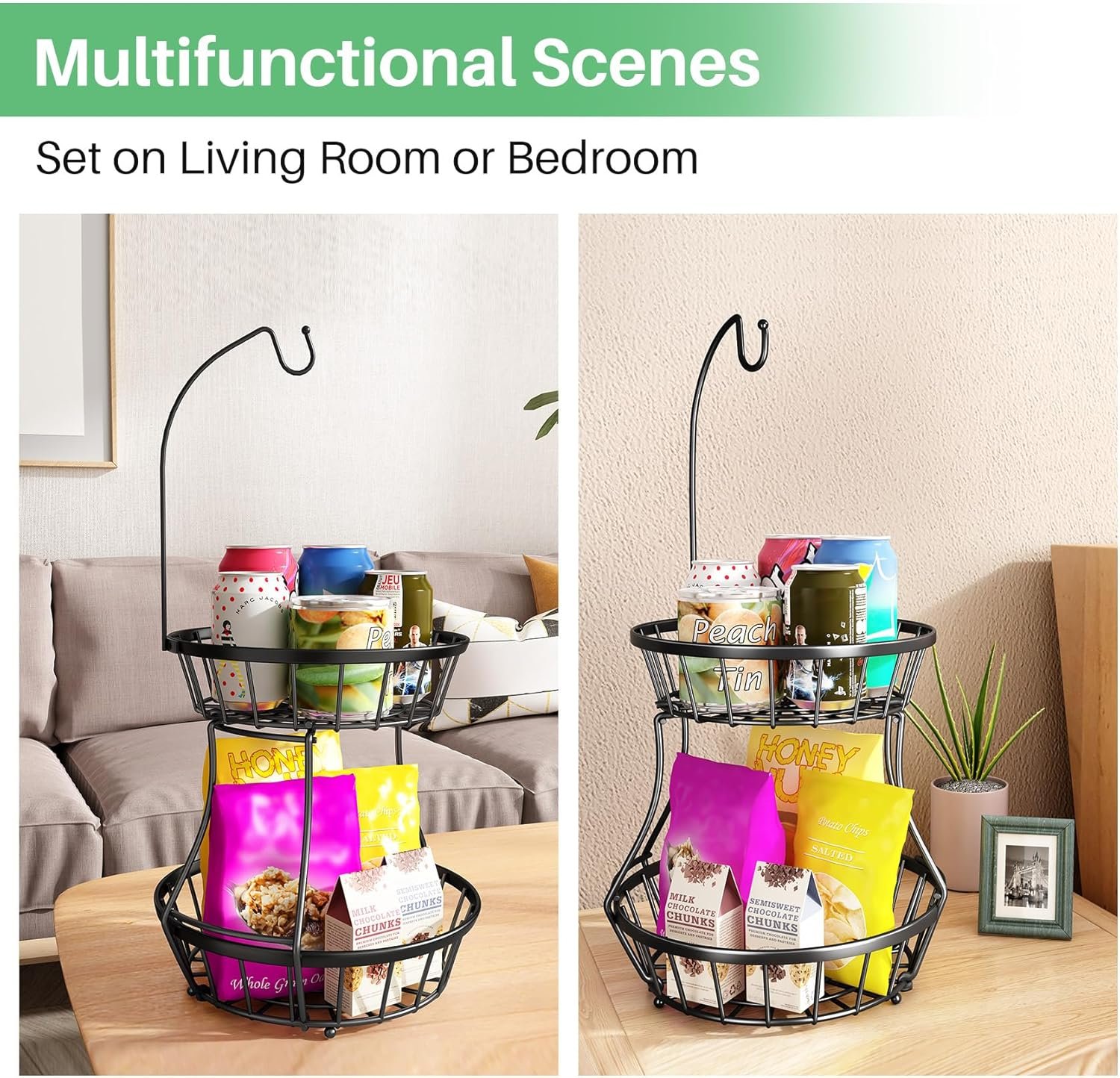 Stackable & Multi-purpose: With stackable wire basket bowl and banana tree hanger attachment, this stylish 2-tier fruit basket stand can be used as two separate baskets for individual serving tray. The fruit stand is designed with an excellent shape which will prevent inside fruits or foods from going tumbling on the floor