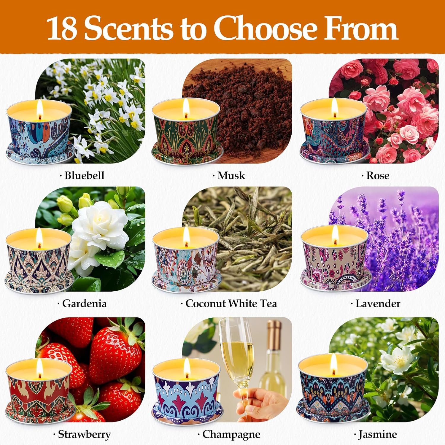 18 Unique & Balanced Fragrances English Freesia, Musk, Jasmine, Lavender, Vanilla, Rose, Sandalwood, Coconut White Tea, Champagne, Lemon, Strawberry, Gardenia, Marigold, Bluebell, Mokara, Grapefruit, Caramel, Balsam & Cedar — fresh, floral, sweet, woody and citrus notes for every mood.