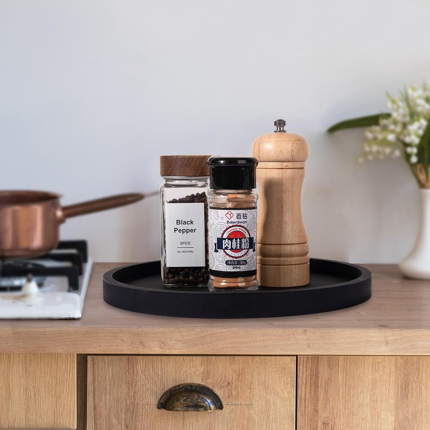 The kitchen tray can store salt, pepper shakers, vinegars, olive oil decanter and other stove top essentials.