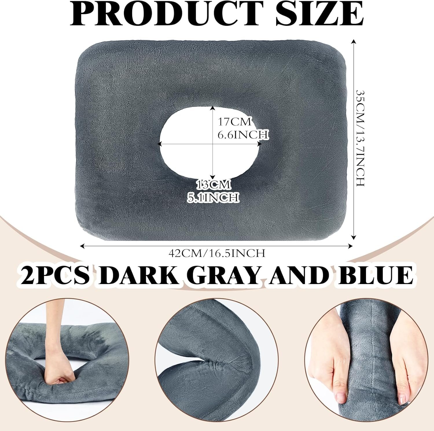 Features: Donut pillow for tailbone can be regarded as a thoughtful and useful gift for your family, friends, colleagues and people who need to sit for a long time. The donut seat cushion adopts a widened and thickened design, which can fit your body shape well and help reduce the pressure on the pelvis, tailbone, waist, etc. Specifications: Material: velvet fabric, cotton Color: dark gray and blue Shape: donut cushion for tailbone pain is made of quality Package includes: 2 x Donut cushions for pressure sores Notes: Manual measurement, please allow slight errors on size. The color may exist a slight difference due to different screen displays. The product is vacuum packed, please let it stand for 48 hours or pat it gently to restore it to the original shape after receiving.