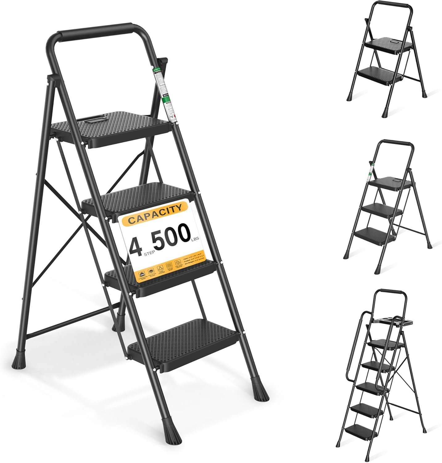 【SAFE & STURDY】Our 4 step ladder made with high-quality steel and a durable construction. Metal safety buckles are automatically locked in place when you use the step ladder