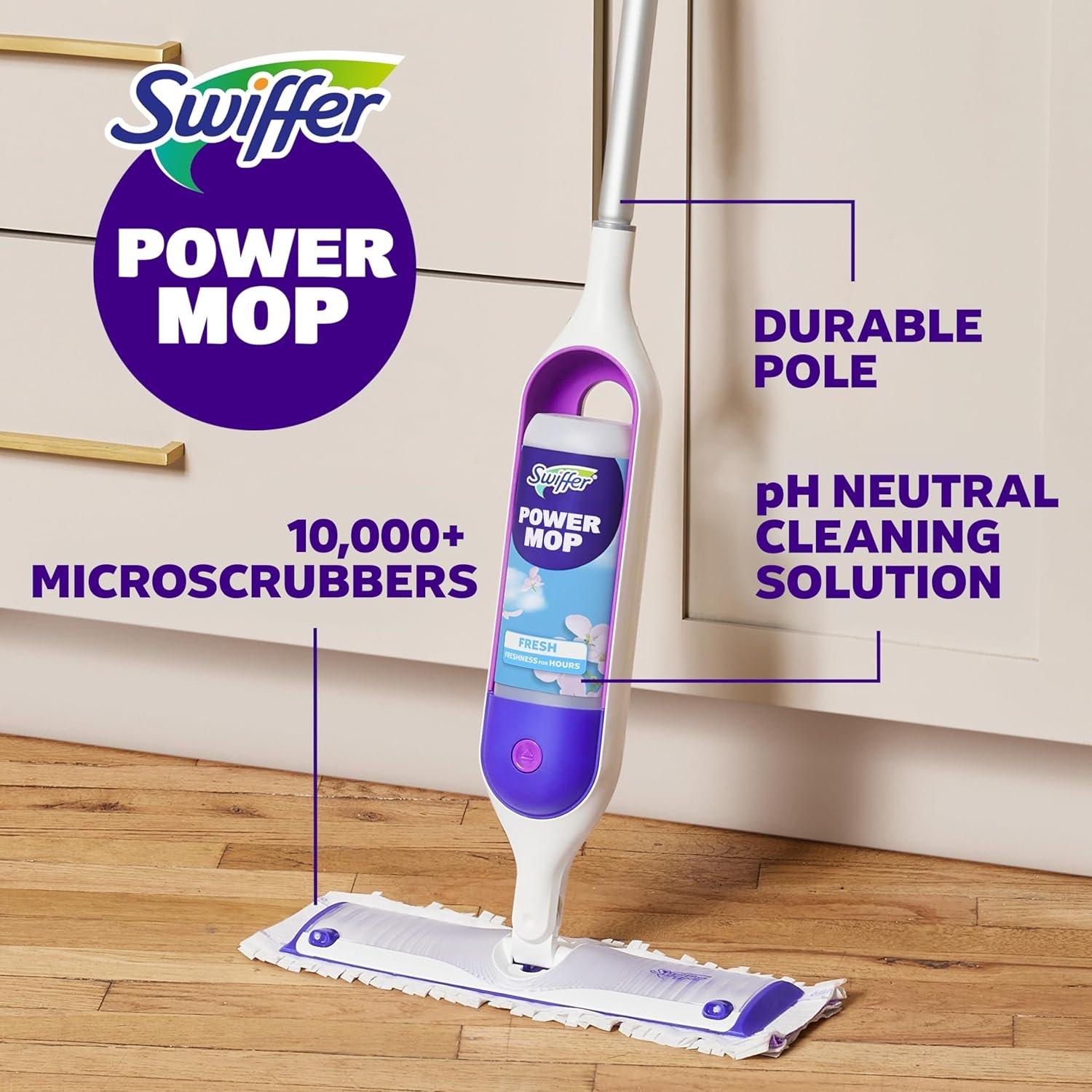 Mop smarter with the Swiffer PowerMop, an all-in-one mopping system that gives you a mop and bucket clean in half the time*. The multi-surface mopping pads have 300+ scrubbing strips that reach deep into grooves and grout to remove sticky spills and daily dirt and grime. The fresh scent of PowerMop solution will fill your home with freshness for hours**. Some assembly required; batteries included. *vs. mop and bucket – includes cleaning and drying time **Leaves behind up to 2 hours of freshness after initial product use