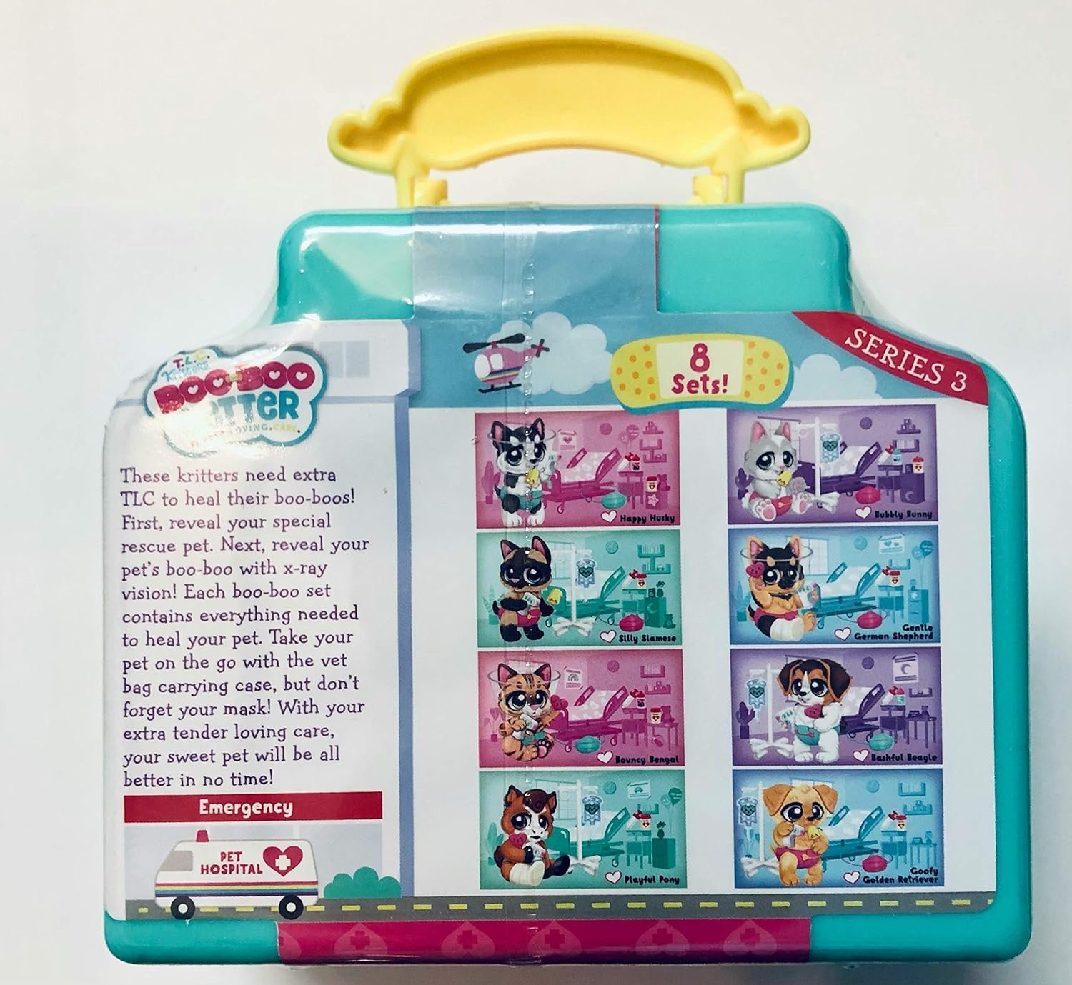 6+. Includes: 1 surprise pet, 1 carrying case, 7 care accessories, 1 x-ray reveal card, 1 diaper, 1 care chart & collector’s poster. Tender. Loving. Cars. (1) Open pet. (2) X-ray boo-boo. (3) Care for pet. Includes: 1 surprise pet, 1 carrying case, 7 care accessories, 1 x-ray reveal card, 1 diaper, 1 care chart & collector’s poster. These Kritters need extra TLC to heal their boo-boos! First, reveal your special rescue pet. Next, reveal your pet’s boo-boo with x-ray vision! Each Boo-Boo Set contains everything needed to heal your pet. Take your pet on the go in the vet bag carrying case, but don’t forget your mask! With your extra tender loving care, your sweet pet will be all better in no time! Emergency Pet Hospital. 8 sets! Happy Husky. Bubbly Bunny. Silly Siamese. Gentle German Shephard. Bouncy Bengal. Bashful Beagle. Playful Pony. Goofy Golden Retriever. Product and colors may differ from those shown. CE listed. Please retain this package, instruction sheet and address for future reference. customer service : 1 (844) 295-8130 / customer-service(at)redwood-ventures.com. 8 sets! Happy Husky. Bubbly Bunny. Silly Siamese. Gentle German Shepherd. Bouncy Bengal. Bashful Beagle. Playful Pony. Goofy Golden Retriever. Made in China.