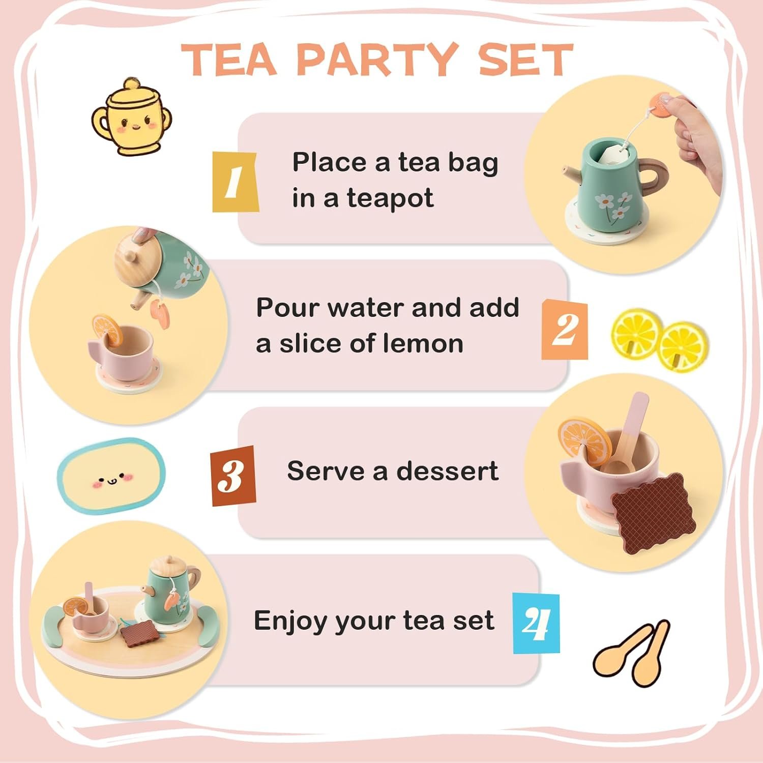 SAFE & PREMIUM MATERIALS: The toddler tea set crafted from high-quality natural wood and coated with non-toxic, child-safe paints. Each piece is smoothly sanded and perfectly sized for little hands — ensuring a safe and realistic play experience for toddlers and preschoolers