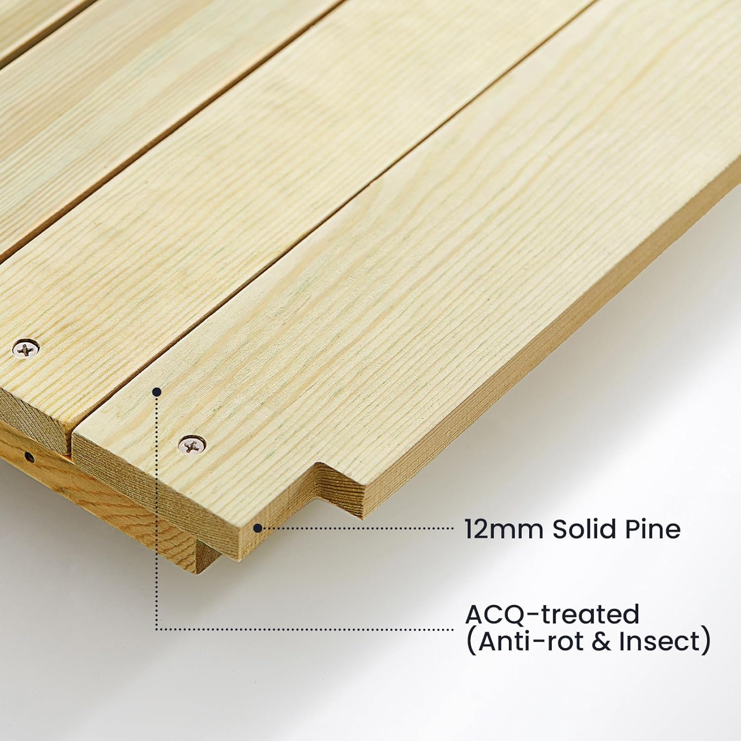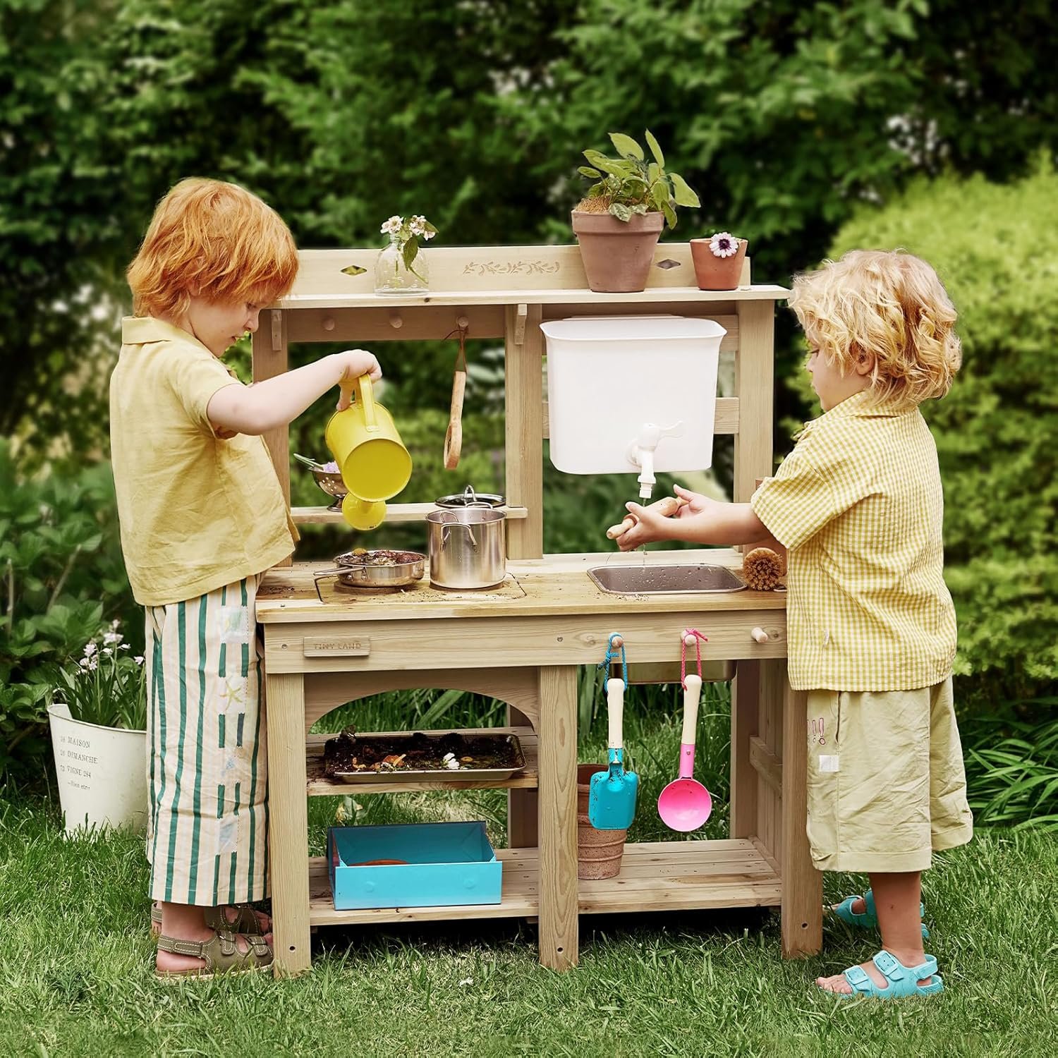 Upgraded Design – Built to Withstand Outdoor Play! Crafted from 12mm thick, sustainably sourced wood and treated with ACQ, this mud kitchen is designed to endure all seasons. 5-strip spliced panel reduces warping and cracking, enhanced sanding processes minimize rough edges and splinters, providing a safer and more enjoyable play experience for little hands.
