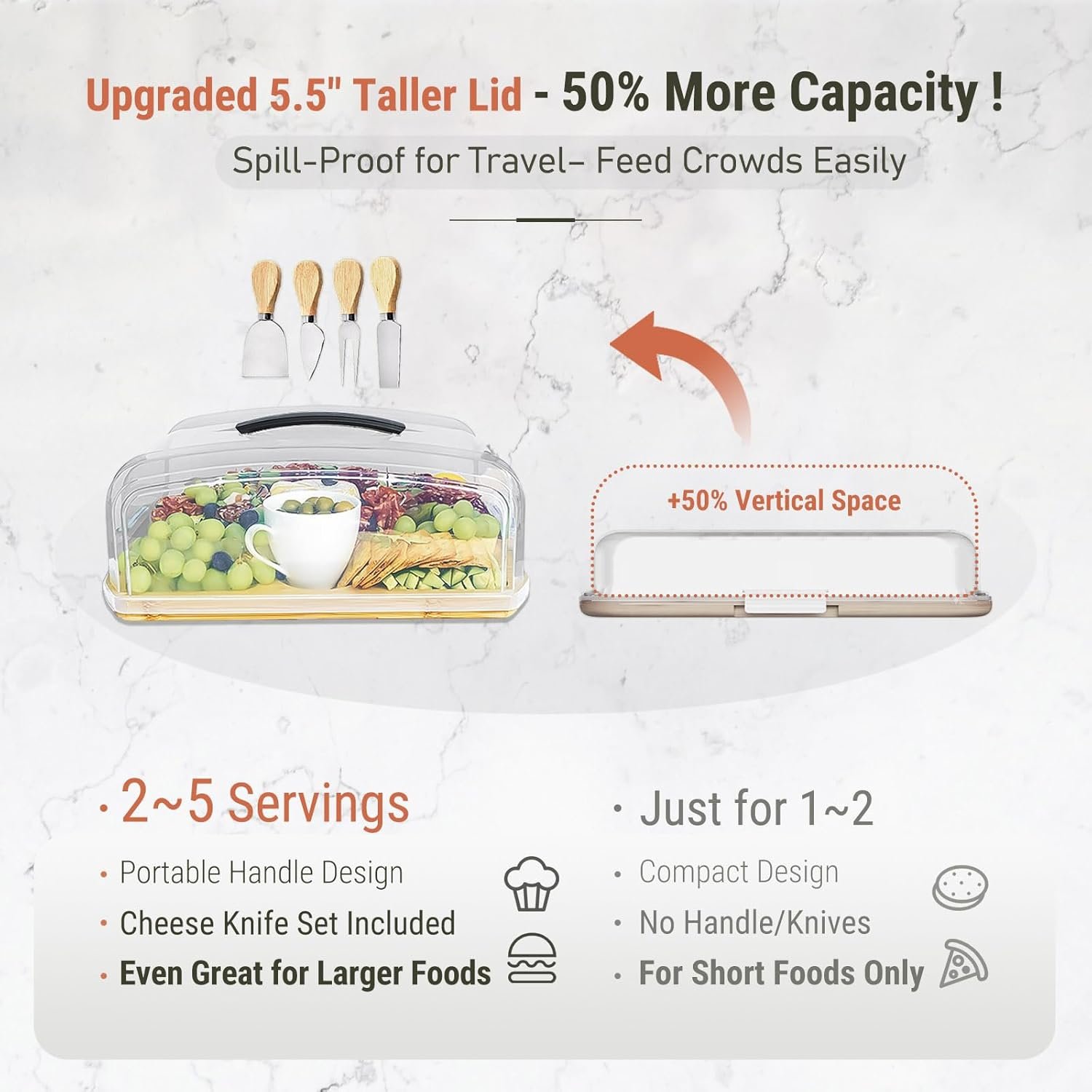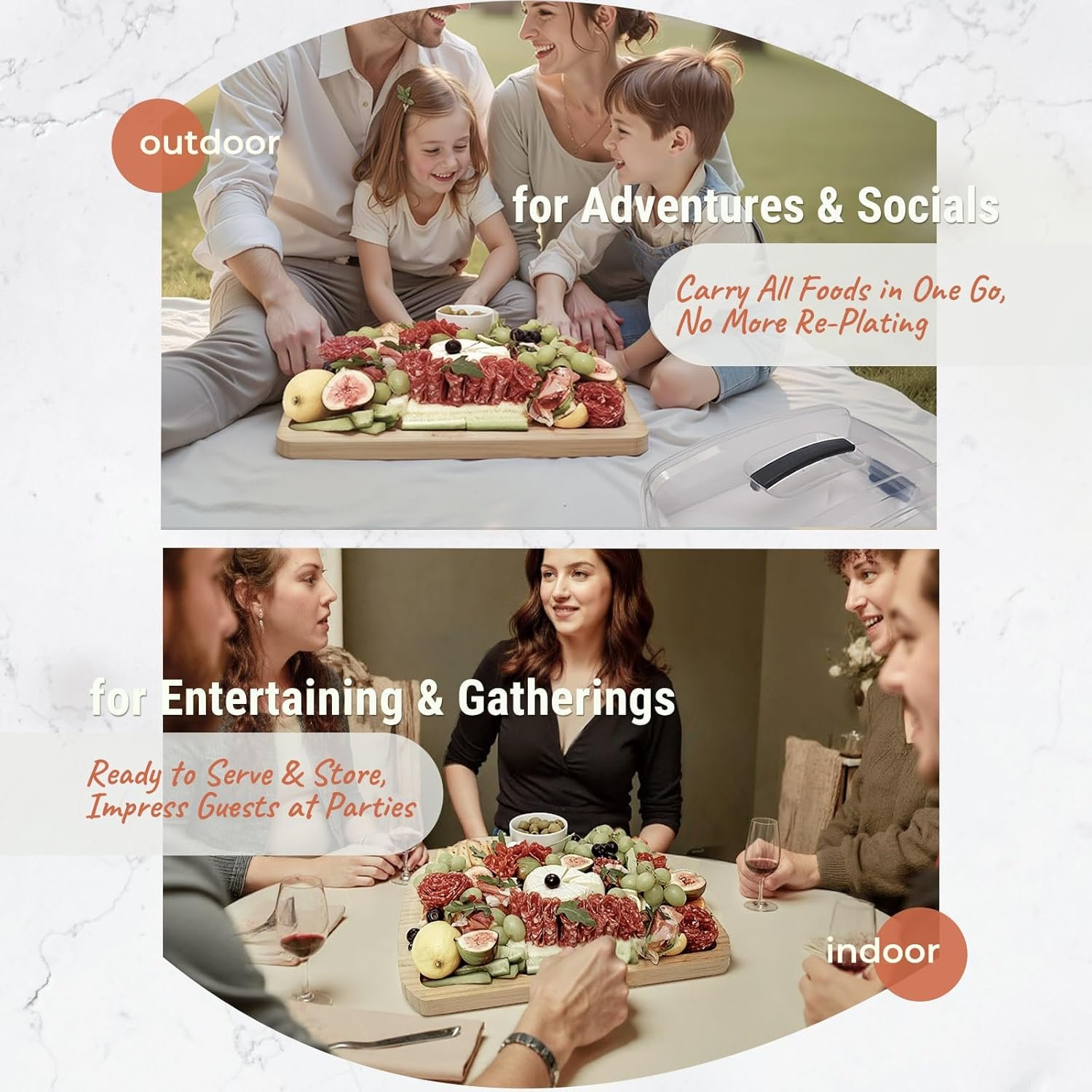 ★2-IN-1 CHARCUTERIE & CUTTING BOARD WITH FLIP-TOP DESIGN:The ultimate space-saver for kitchens and picnics! Use one side as a charcuterie board to display meats, cheeses, and crackers, then flip it over to the food-grade cutting surface for slicing veggies. The smart design lets you prep, serve, and store in one go—just cover with the included lid and chill in the fridge, no messy transfers. Perfect for small kitchens, outdoor parties, or anyone who hates extra dishes