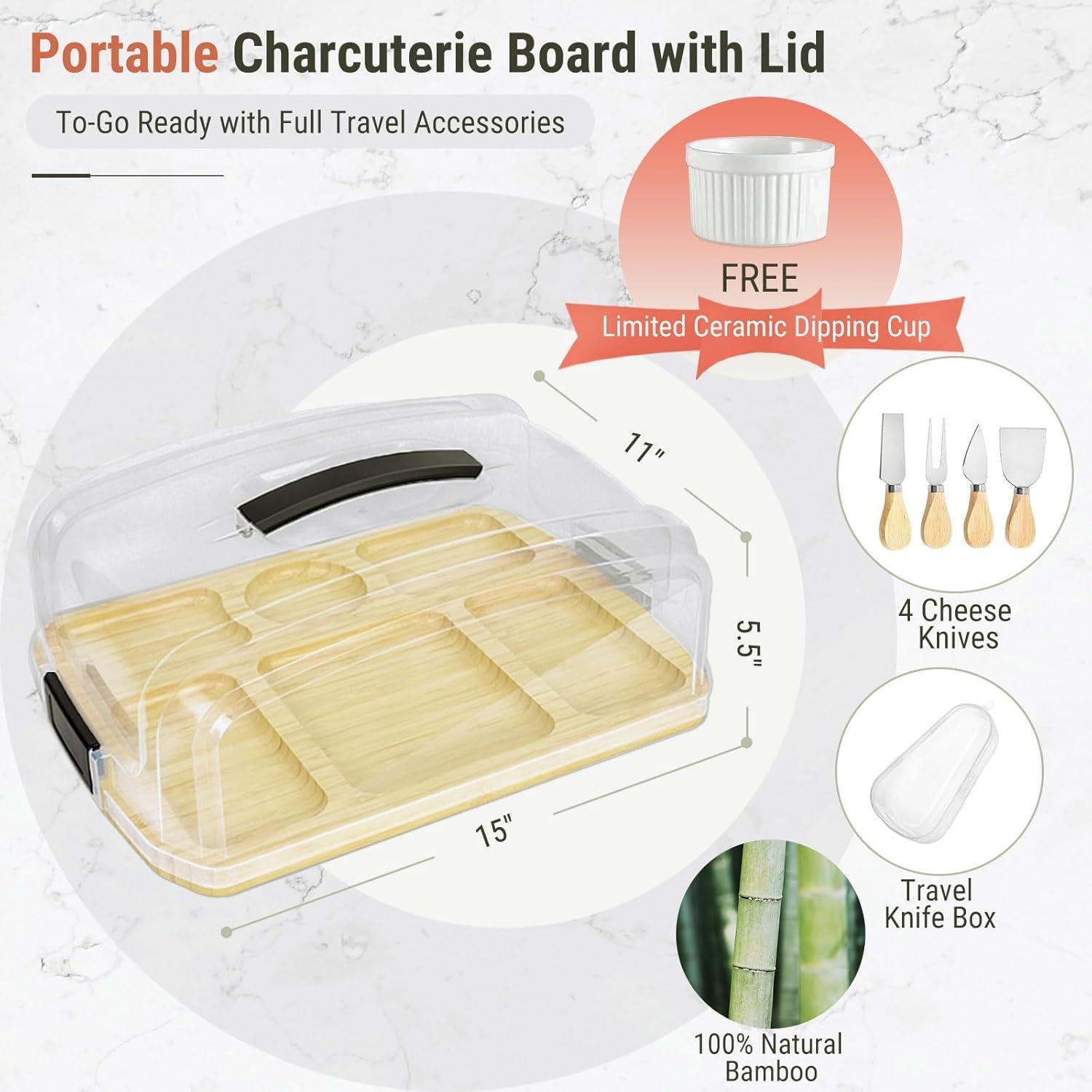 to-Go Ready Charcuterie Board with Lid & Handle for Travel, Flip-to-Cut Bamboo Cheese Tray, with Cheese Knives & Accessories, Gift for Women — Birthday, Housewarming, Bridal Shower & Weddings