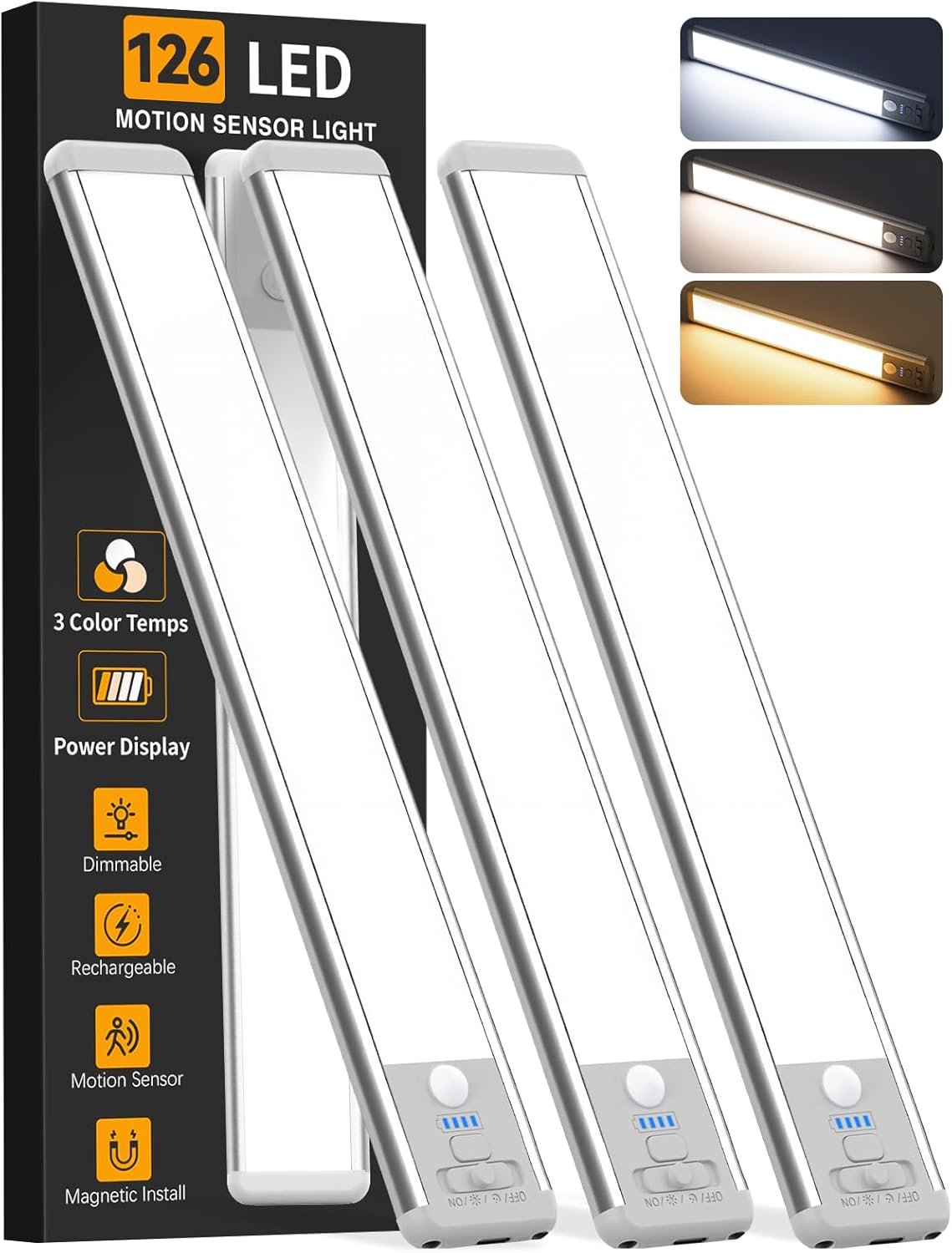 3 Color Temps & Dimmable: The LED under cabinet light provides 3 lighting color temperature options, including white light, warm light, and natural light, and is designed with a 50%-100% brightness stepless adjustment function. A variety of adjustable lighting modes enable the motion sensor light to be better applied in more occasions.