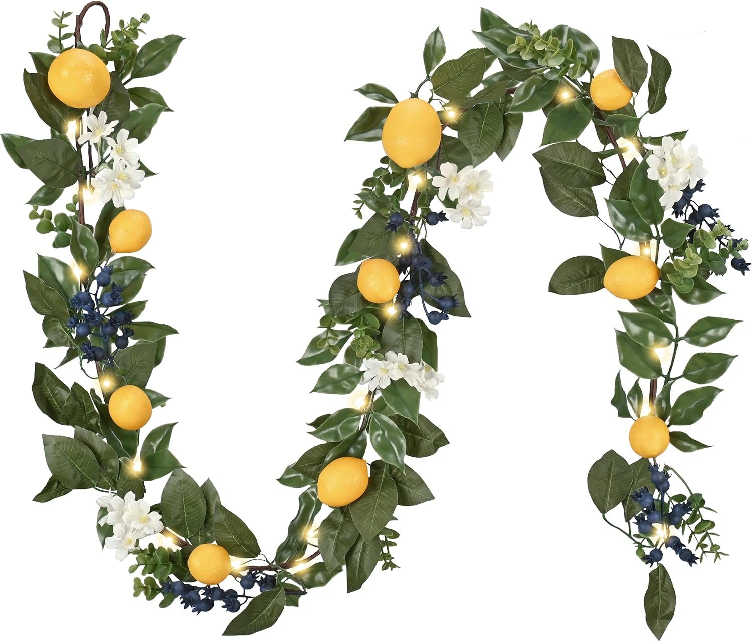 【EXQUISITE CRAFTSMANSHIP】 Treated with the latest pressing technology to prevent leaves from falling, this garland features ultra-realistic fake lemons, cute blueberries, and dense eucalyptus leaves. Unlike flimsy competitor products where lemons detach easily, our garland features securely attached lifelike lemons and other accessories for a full-bodied, premium look