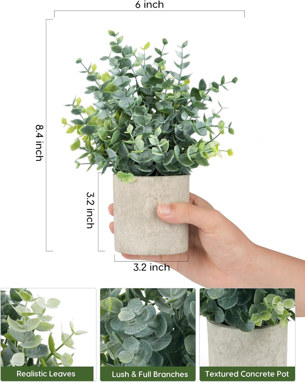 Compact Size, Perfect for Any Space: Velener potted small fake plants indoor with pot measures 3.2*3.2*8.4 inches and fits every space. Designed with flexible stems, the eucalyptus branches can be shaped and fluffed to achieve your ideal look, adding a natural, full appearance that suits any style of decor.
