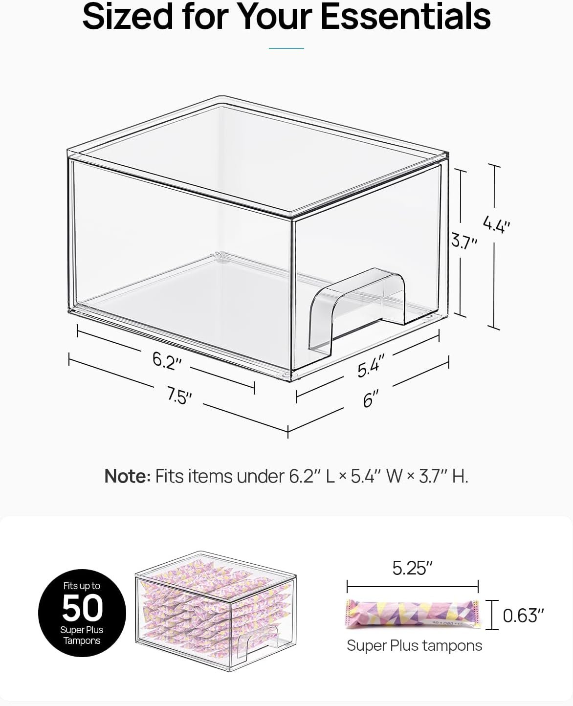 [Stackable Design] Come with 4 drawer storage organizers, the outside box measures 7.5″D x 6″W x 4.4″H,the drawer measures 6.9″D x 5.4″W x 3.7″H,it is usable size. Please measure the space of using before purchasing.The storage containers are stackable, vertical storage will save a lot of space. You can also use them side by side. Put your small objects on top of acrylic bins to make your countertop space more tidy.