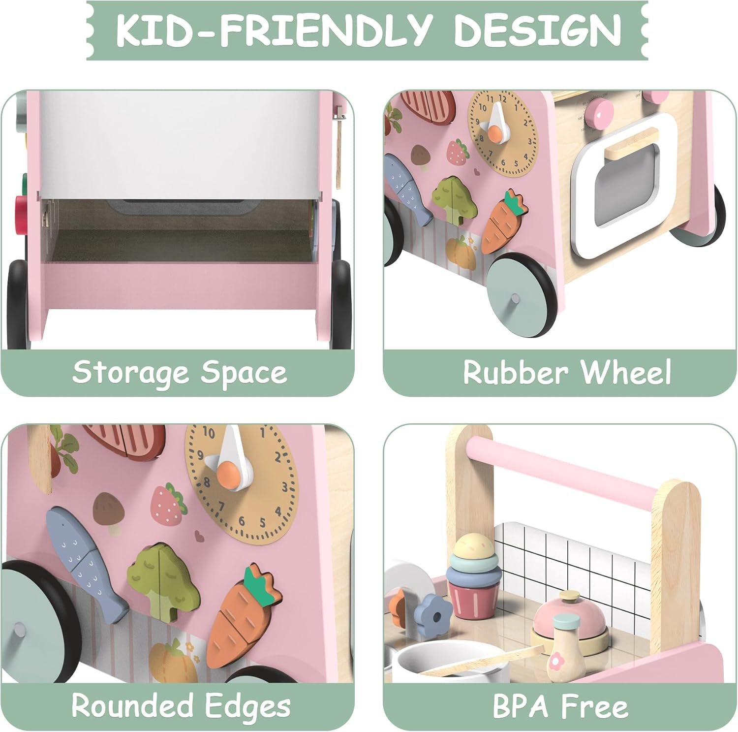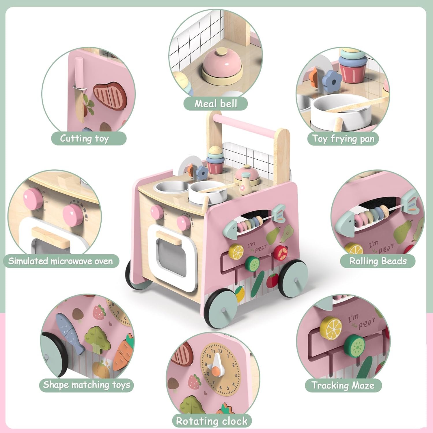 MULTIFUNCTIONAL DESIGN: The wooden walker stroller combines the functions of a baby walker, a pretend kitchen play set, a montessori sensory toys activity center and a doll stroller, perfect for toddlers’ early learning and walking development. Develop cognitive and coordination skills, enhance early creativity, and promote brain development and motor skills as babies move from sit to stand.