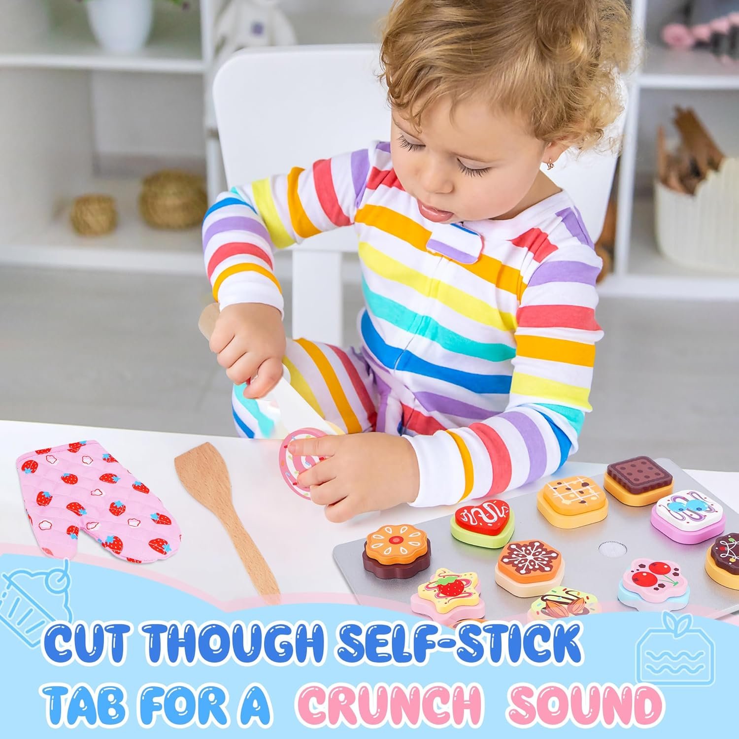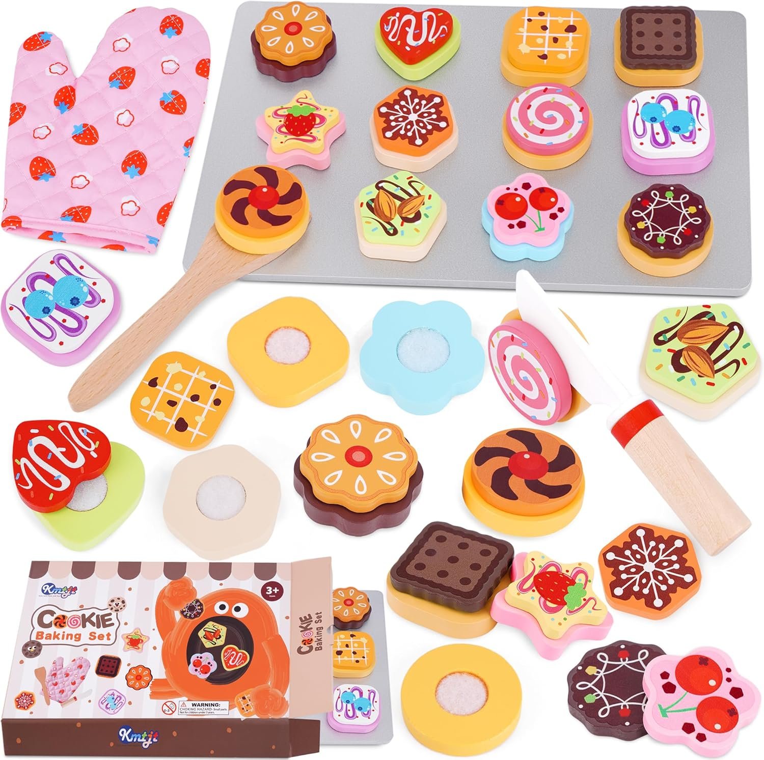 【Premium Quality Wooden Toy】Introducing our wooden cookie slicing and baking play set, which includes 12 sliceable cookies, 12 toppings, a slicing knife, a spatula, cookie sheets, and kitchen mitt. The set is complemented by a durable storage bag, ensuring all pretend kitchen accessories are neatly stored and ready for the next play session.