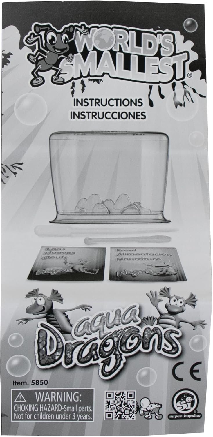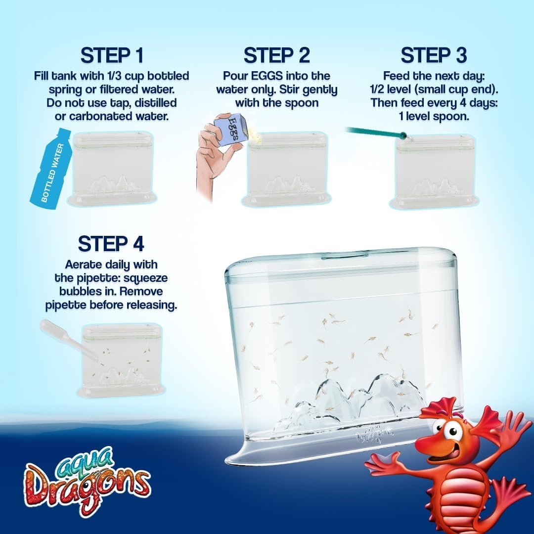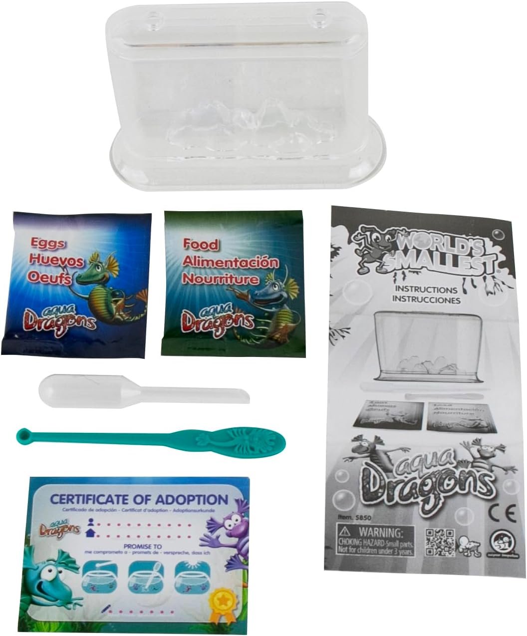 COMPLETE MINI SCIENCE KIT: Includes 1 miniature tank, live Aqua Dragon eggs, food, air bubbler, spoon, certificate of adoption, and clear instructions. Tank measures 4.25 x 1.5 x 3.5 inches.