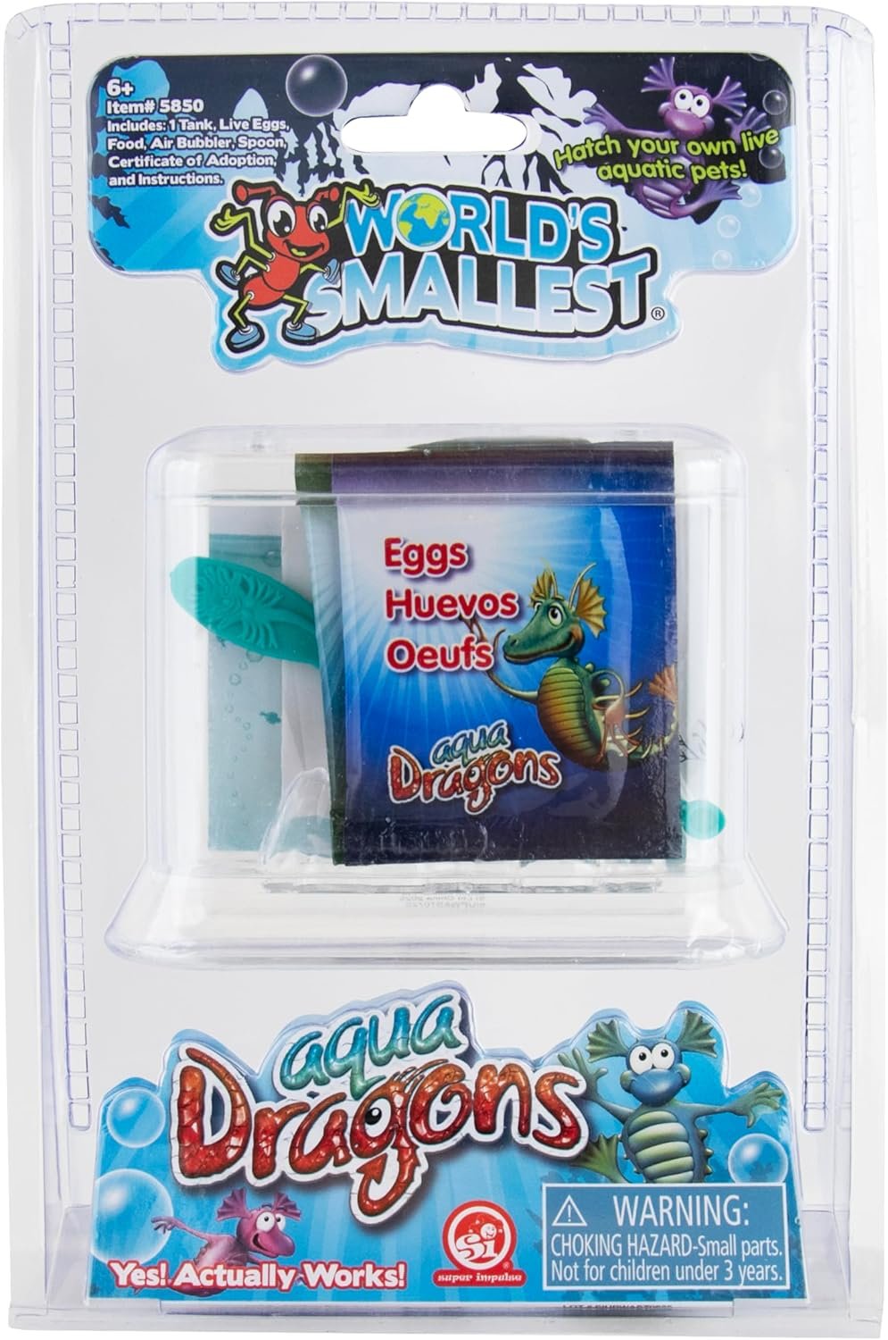 Bring aquatic discovery to life in a tiny tank with World’s Smallest Aqua Dragons. Simply add water and eggs to hatch real, living aquatic pets and watch them grow, swim, and thrive right before your eyes. This miniature version delivers the same classic Aqua Dragons experience in a collectible size, letting you care for your creatures and manage their life cycle through feeding and observation. Each set includes everything needed to get started – 1 compact tank measuring 4.25 x 1.5 x 3.5 inches, live eggs, food, air bubbler, spoon, certificate of adoption, and easy instructions. No batteries required. A fun, hands-on gift for curious kids, collectors, and aquatic explorers of all ages, perfect for birthdays, holidays, or just because. Recommended for ages 6+.