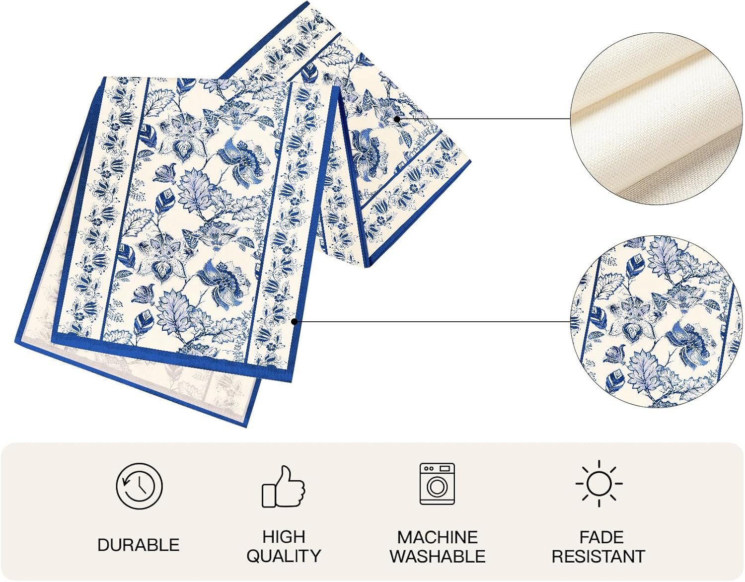 Our table runner are patterned with blue floral, made from durable material, anti-slip, heat and cold resistant, very usable for both holiday and daily use.