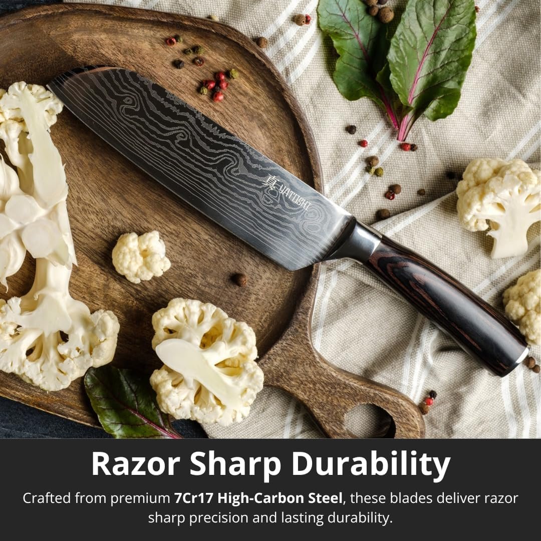 High Carbon Blades: Made with premium 7Cr17 High Carbon Steel that provides a razor-sharp professional quality blade. The steel contains 0.6-0.75 carbon, making it two times tougher than other knives in its class with a Rockwell Hardness of 57-58. Each blade is finished with an elegant waved pattern that adds a touch of artistry while highlighting its precision craftsmanship.