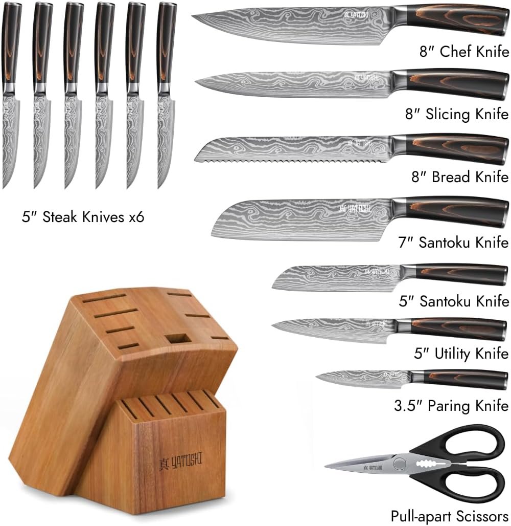 Set Includes: 1x 8” Chef’s Knife, 1x 8” Bread Knife,1x 7” Santoku Knife, 1x 8” Slicing Knife, 1x 5” Santoku Knife, 1x 5” Utility Knife, 1x 3.5” Paring Knife, 6x 5” Steak Knife, 1x Pull-apart Scissors, 1x Acacia Wood Knife Block